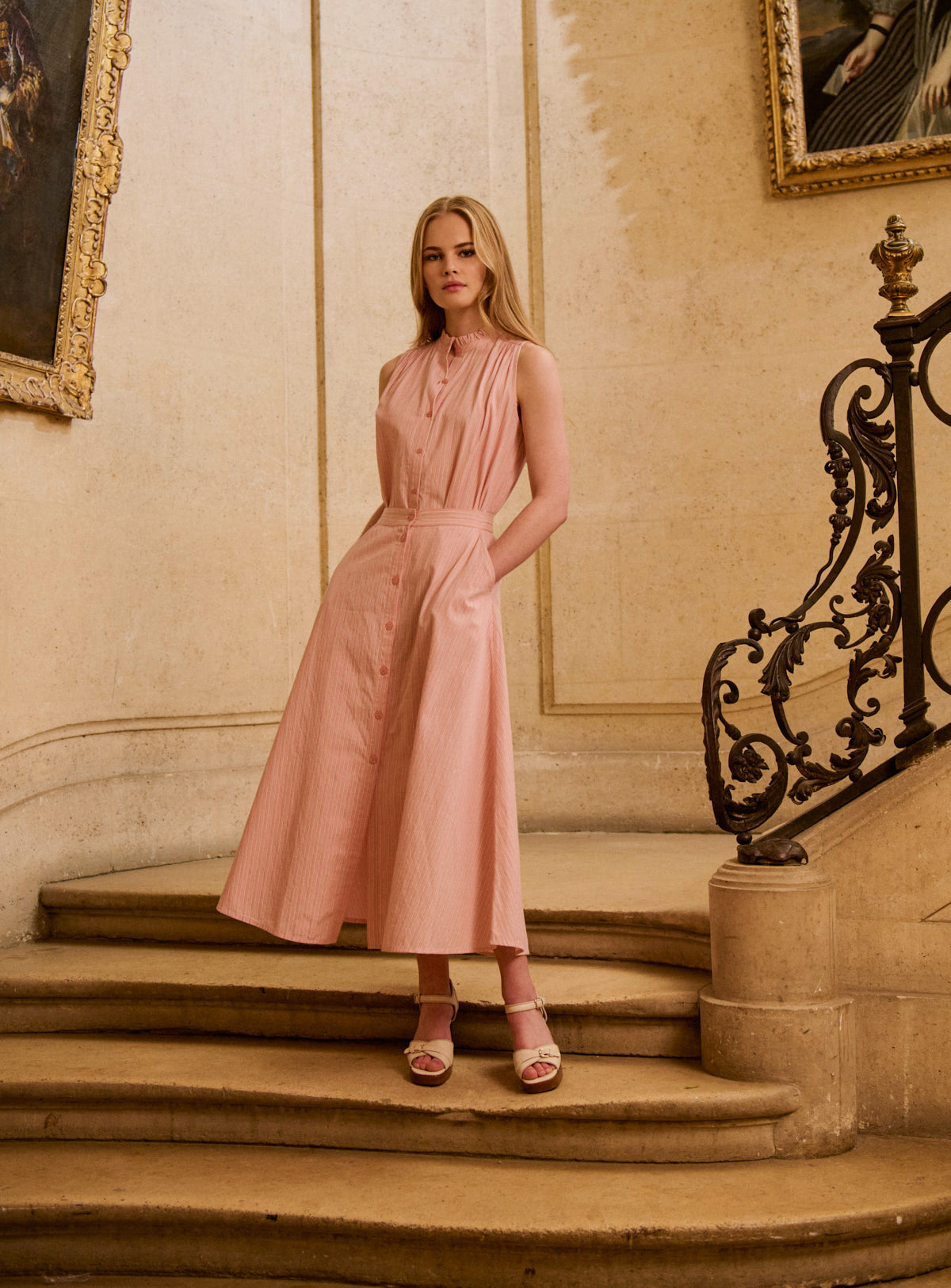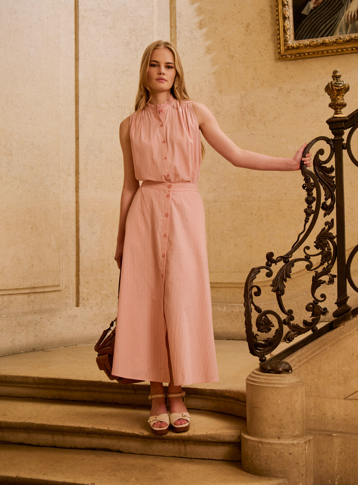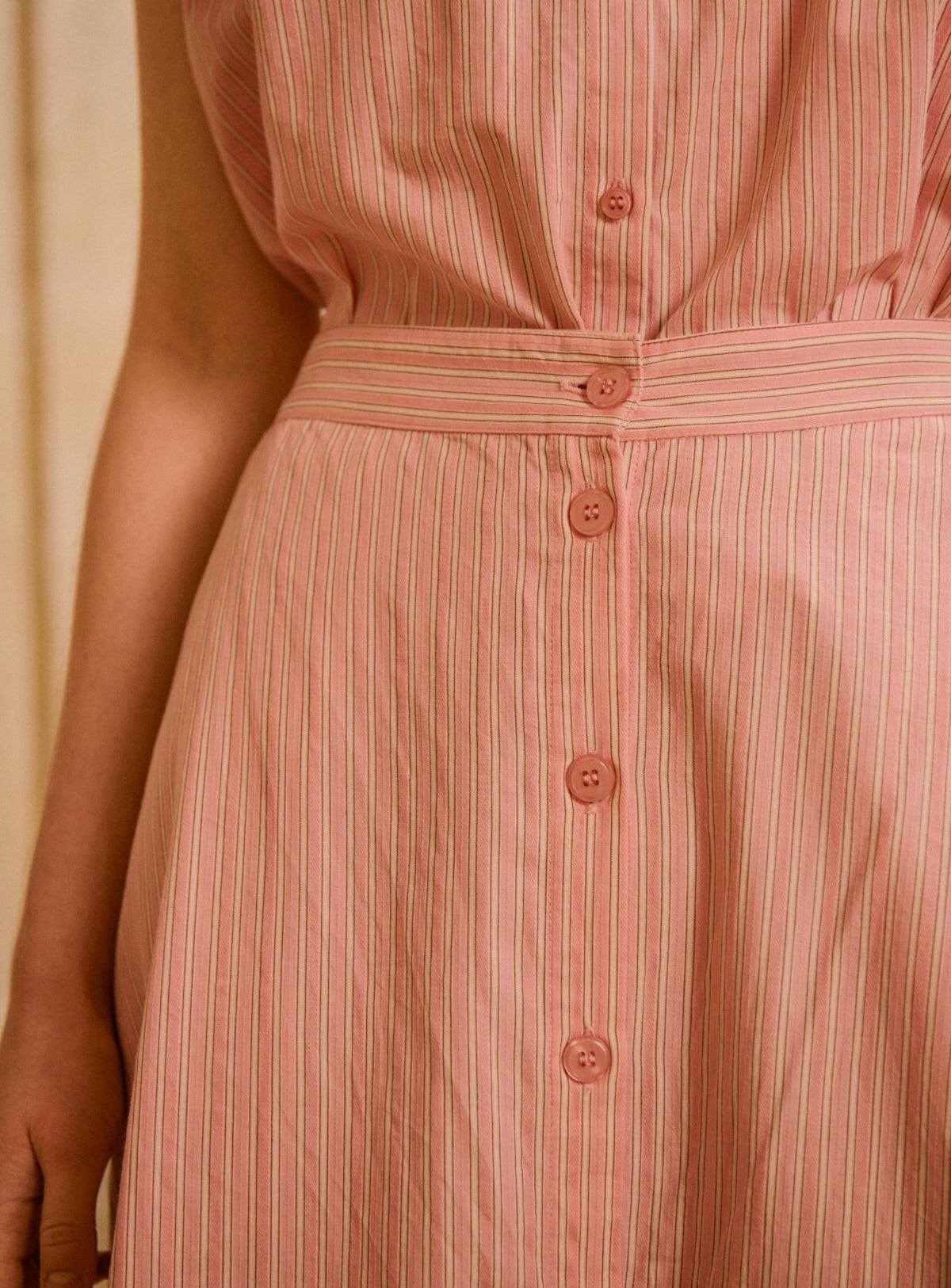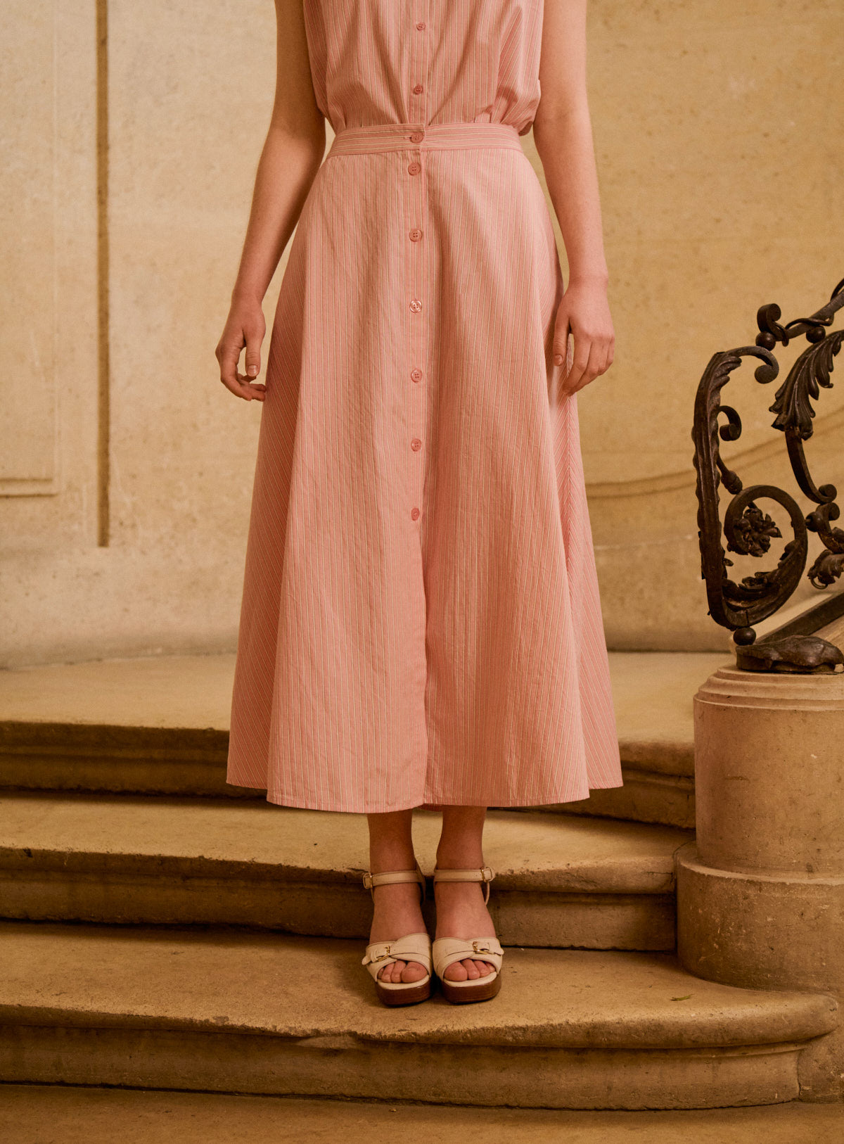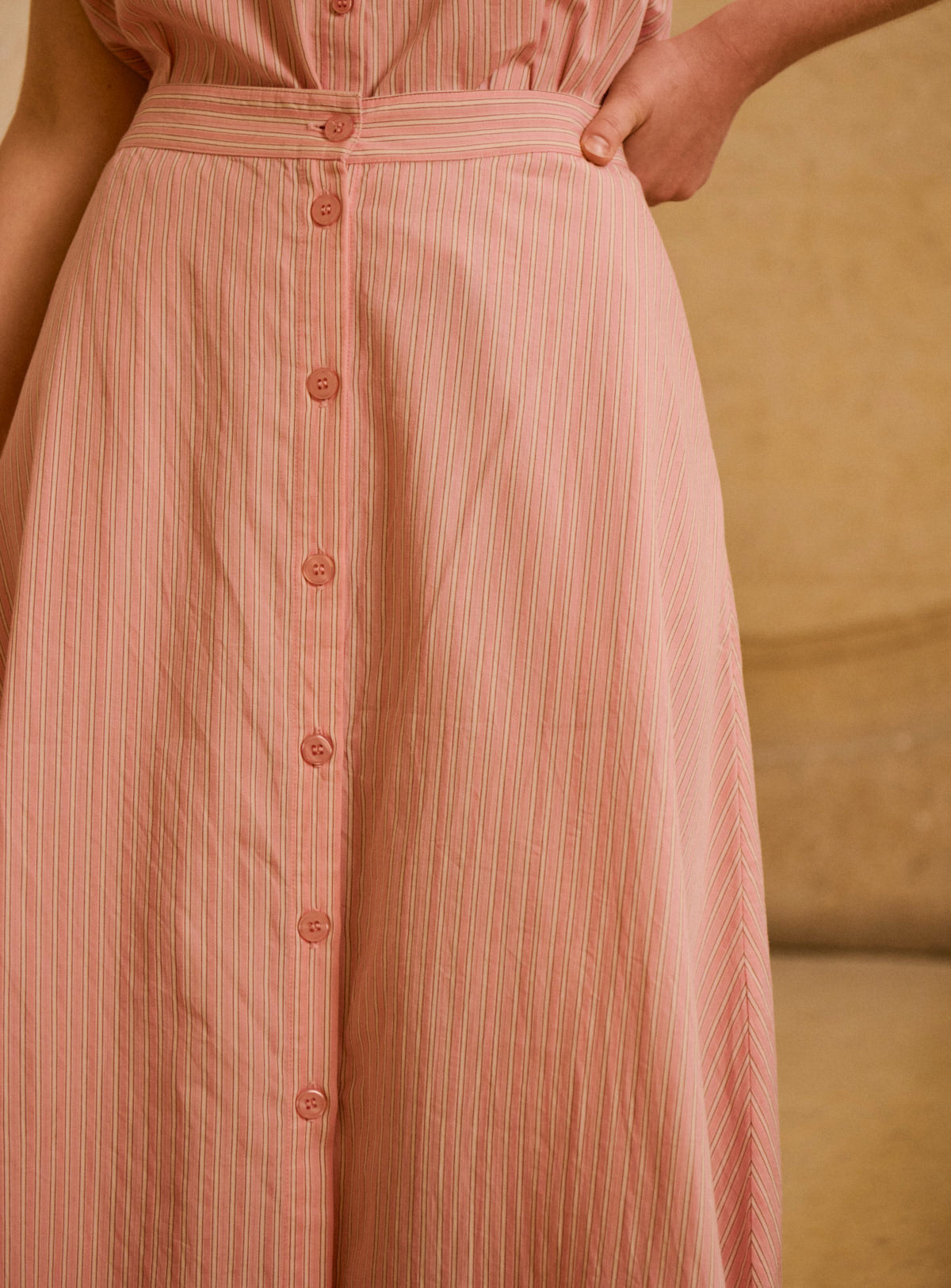 Pourquoi nous l'aimons : Cet ensemble séduit par sa rayure fine et délicate, qui allonge la silhouette avec élégance. Le jeu de lignes apporte structure et légèreté, tandis que la coupe fluide assure un porté confortable et féminin. Une allure facile, à porter au quotidien comme pour les beaux moments de la saison. Cette jupe rayée rose associe confort et élégance avec son tissu léger et son ouverture boutonnée subtile. Parfaite pour un look bohème chic, elle s’accorde parfaitement avec le top NADINE pour un total look coloré et élégant.