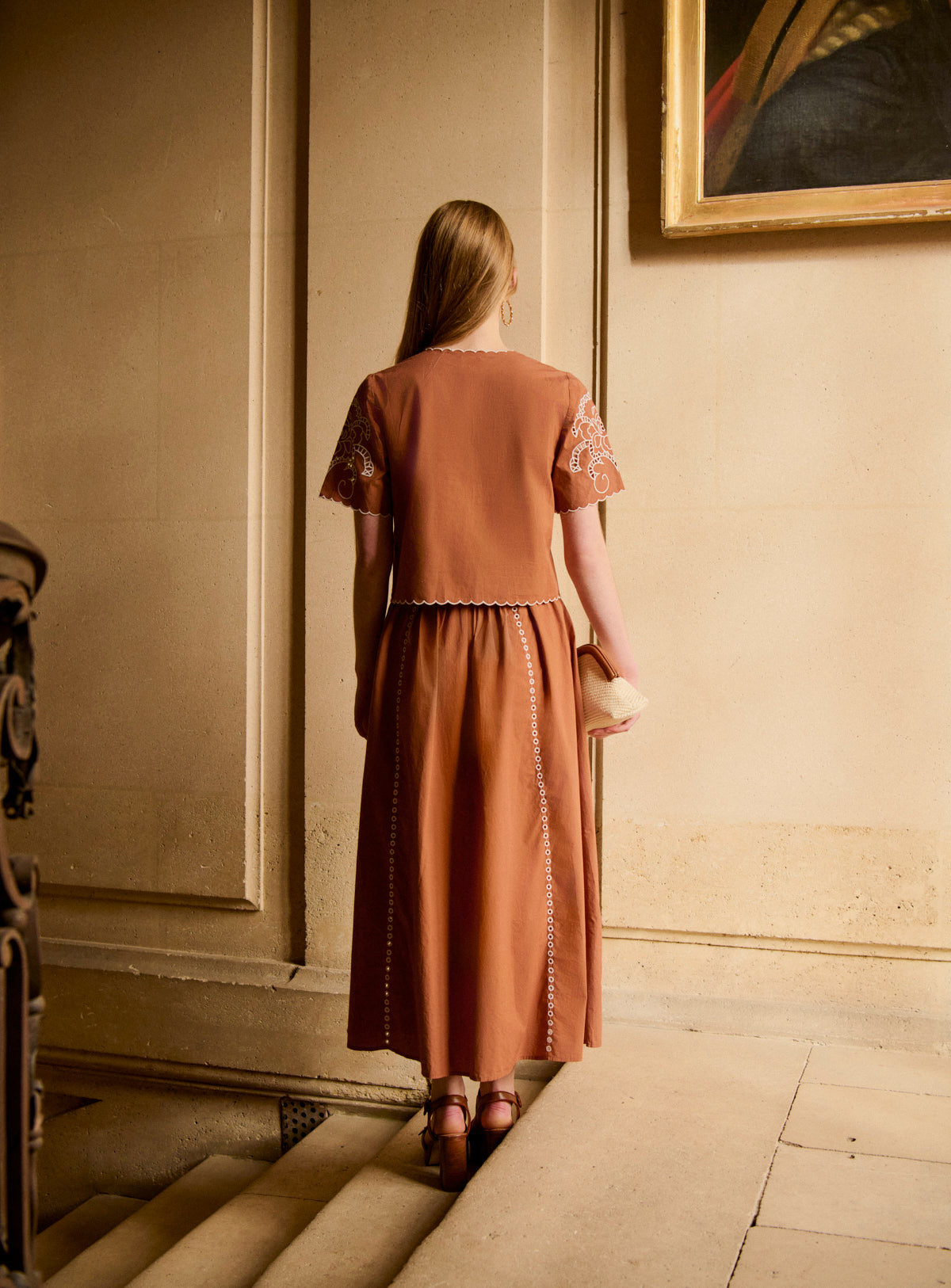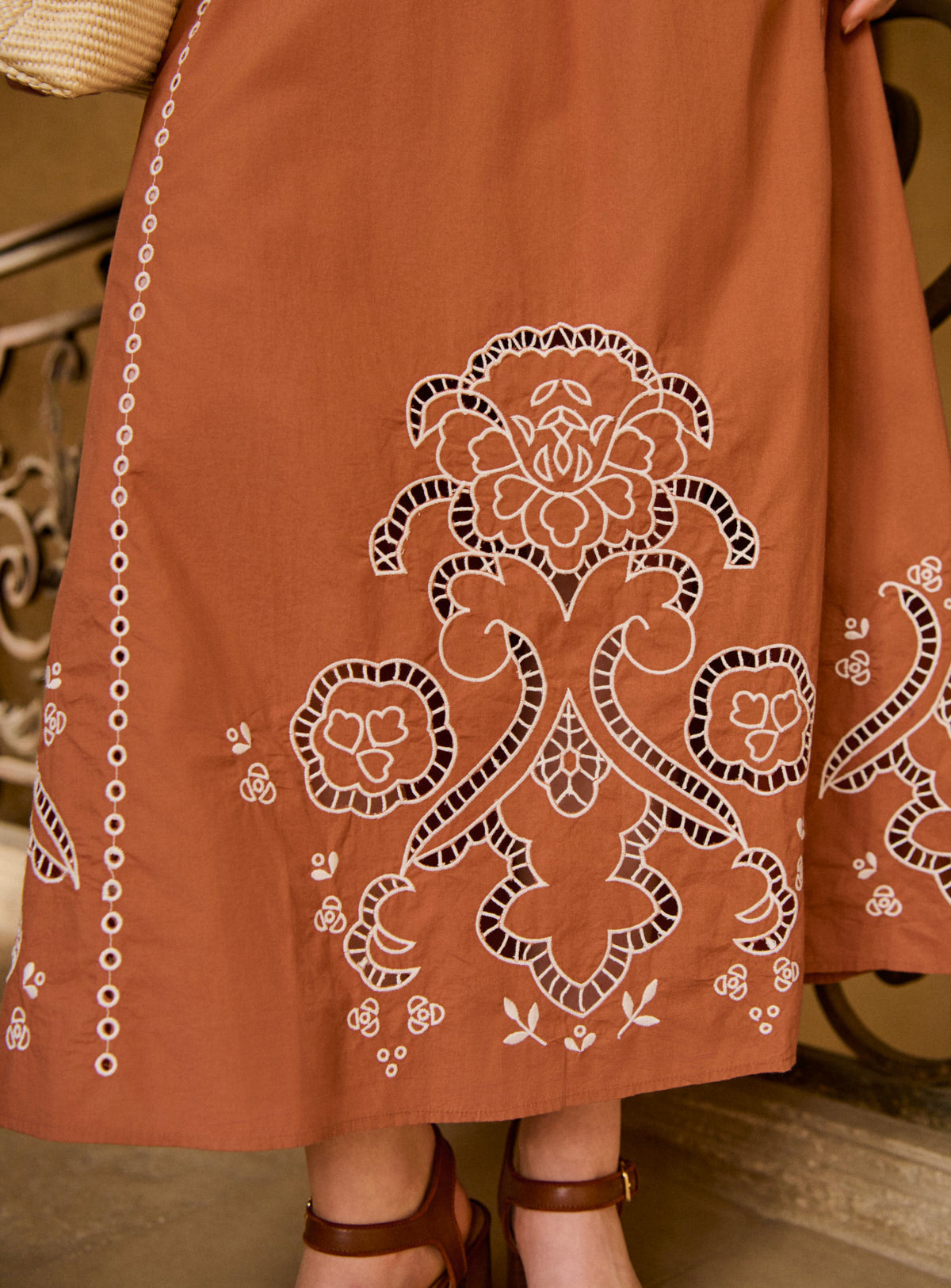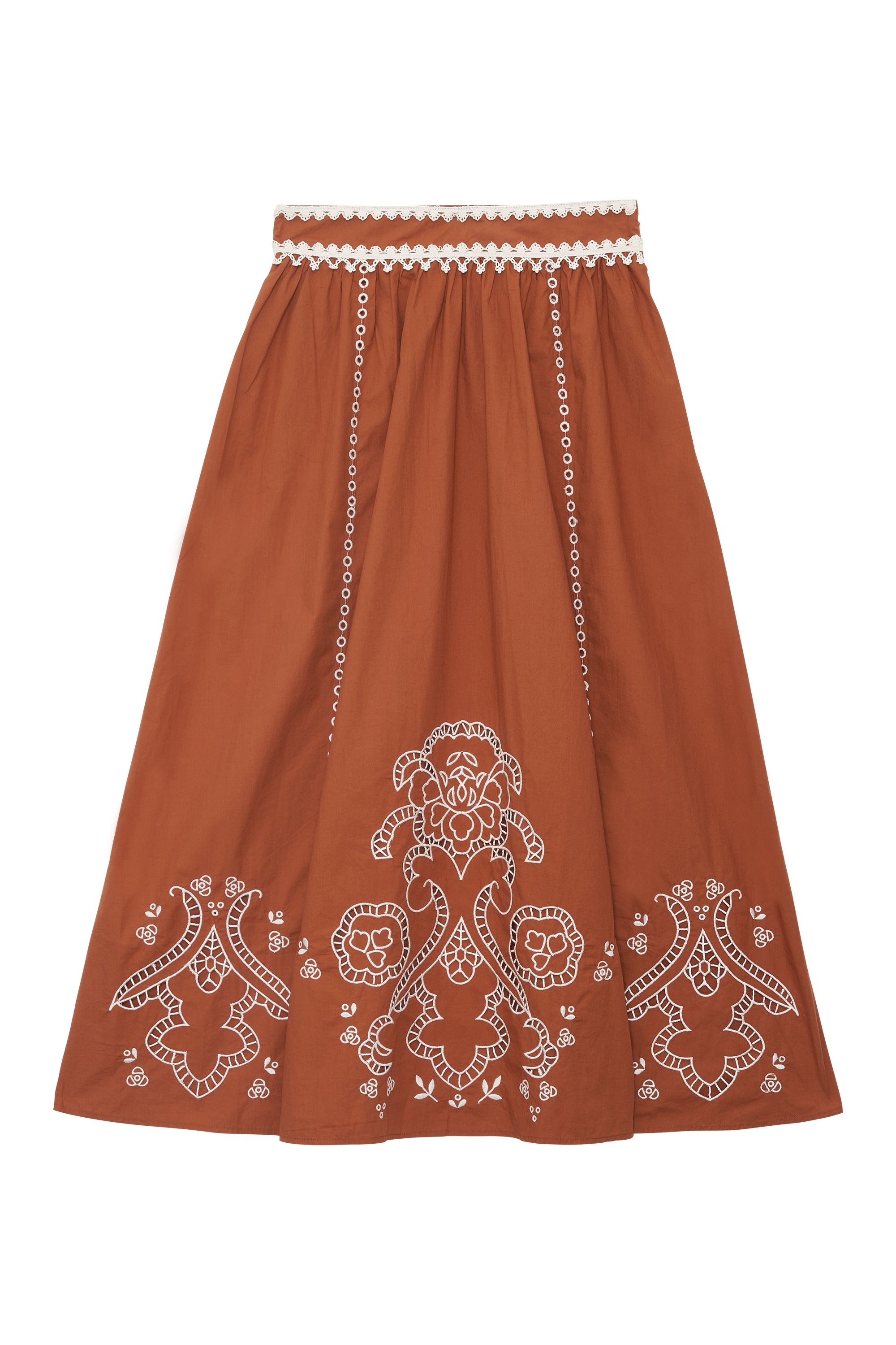 Jupe longue ajourée orange avec détails broderie blanche