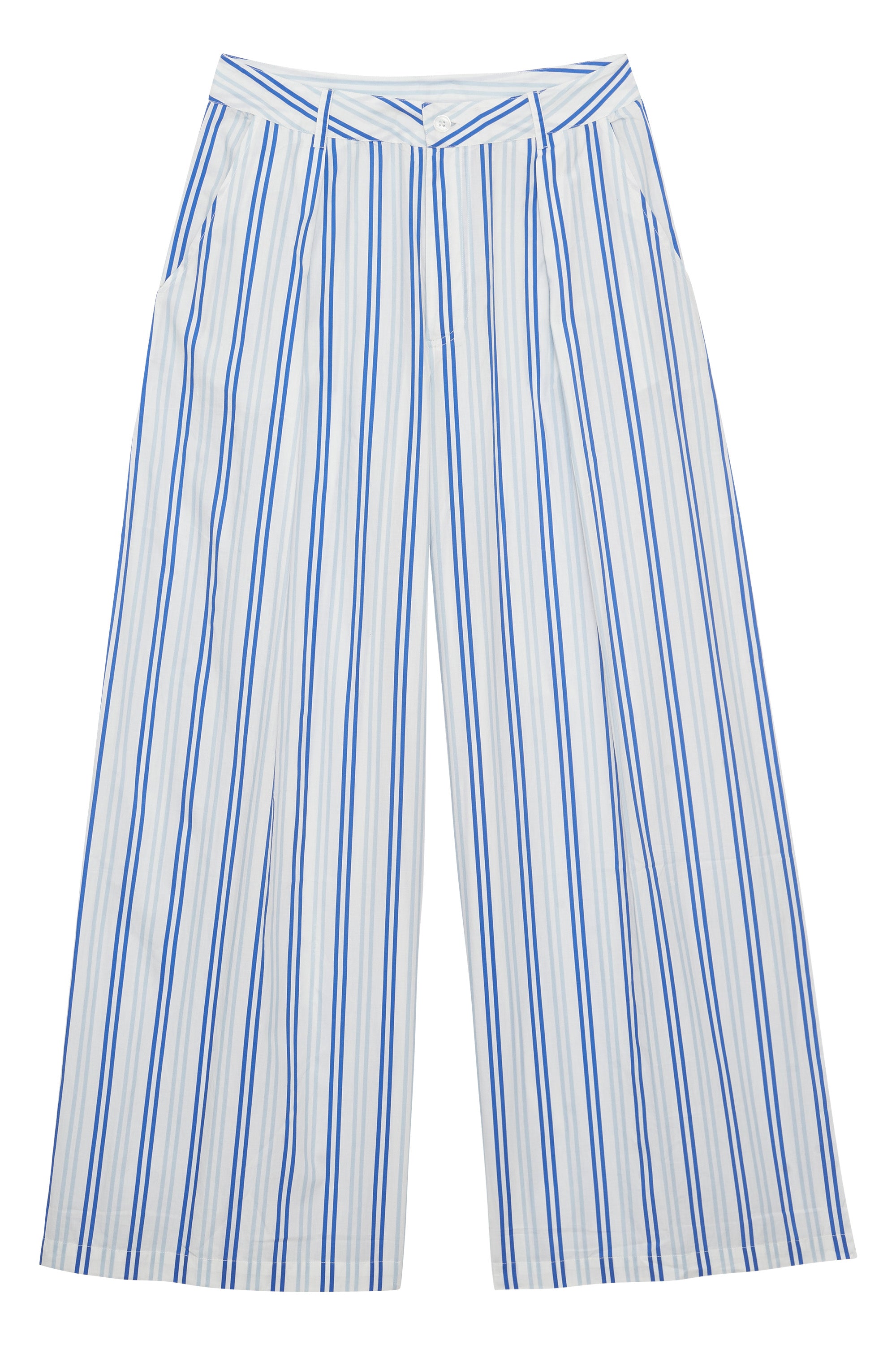 Pourquoi nous l'aimons : Avec ses doubles rayures bleues, ce pantalon dessine une allure estivale à la fois fraîche et affirmée. Sa coupe large et sa matière confortable accompagnent le mouvement avec élégance, tandis que sa taille haute structure et allonge la silhouette. À porter avec notre blouse TEA pour une silhouette chic, décontractée et facile à vivre.
