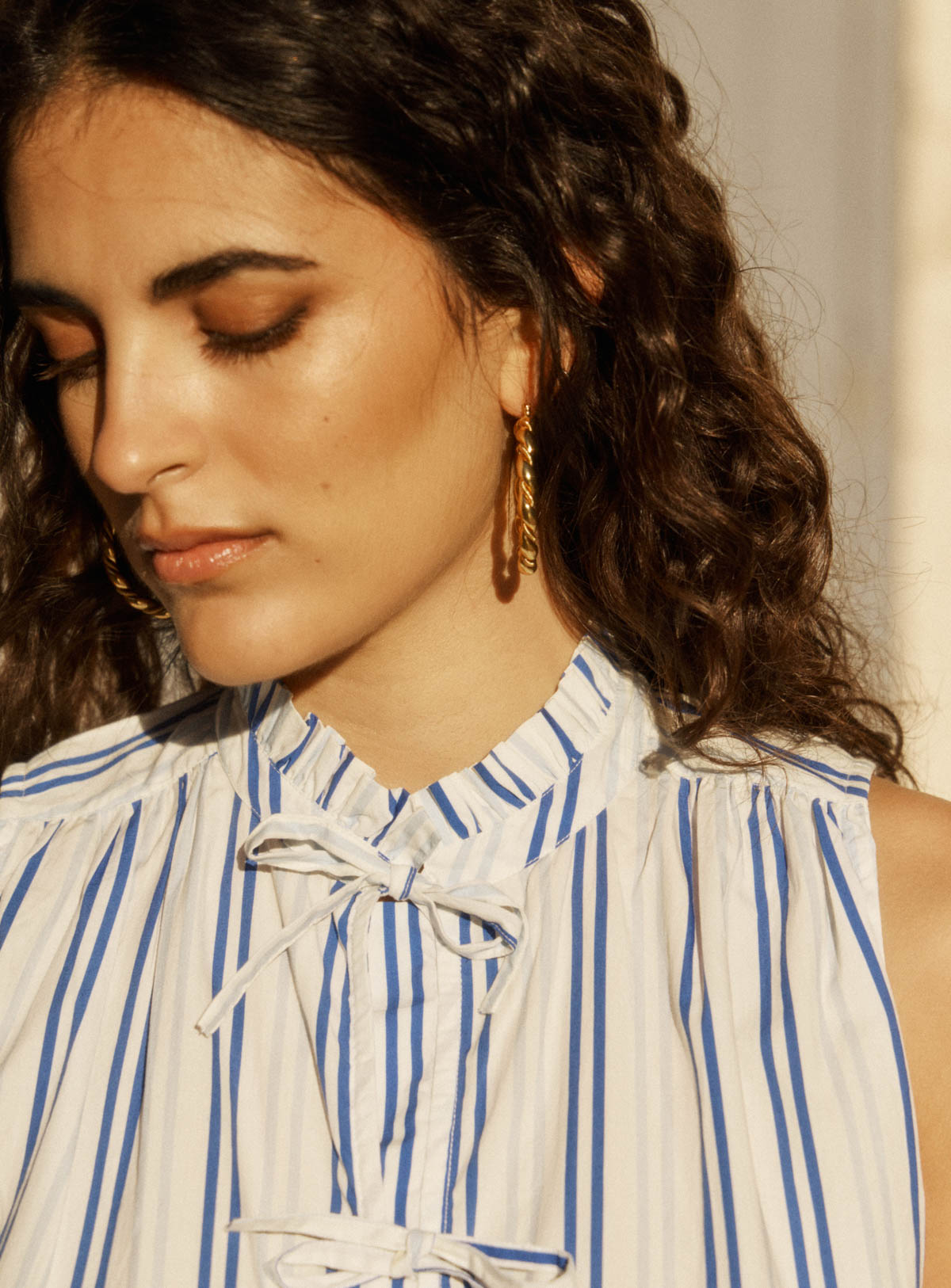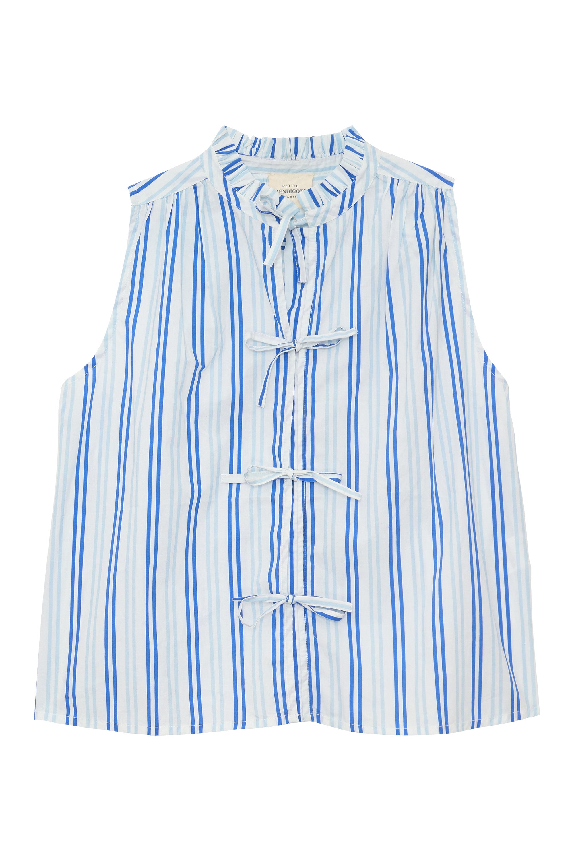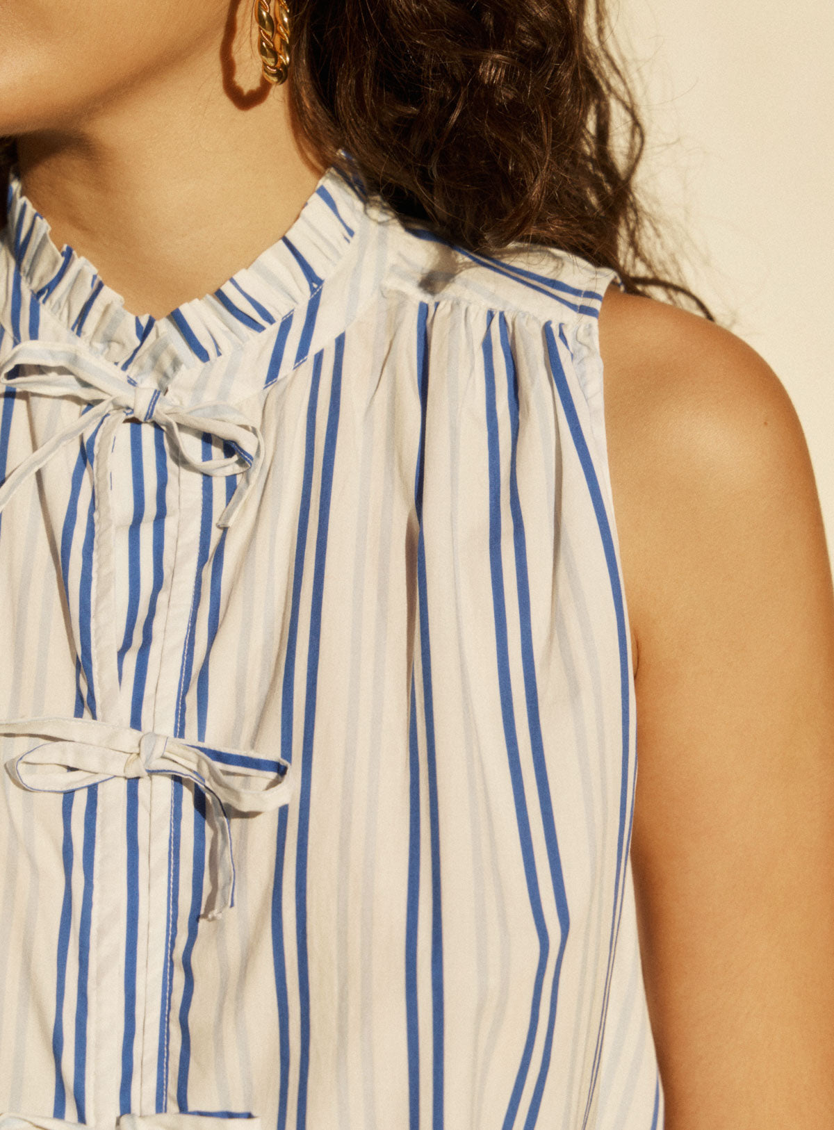 Pourquoi nous l'aimons : Ce top au col montant froncé apporte une touche pétillante aux silhouettes de saison grâce à son imprimé rayé délicat. Sa fermeture par quatre nœuds sur l’avant signe un détail féminin et raffiné, tout en laissant deviner subtilement la peau. Associé à la jupe JEANNE, il compose un total look rayé et coloré à l’élégance naturelle. Sa rayure fine allonge la silhouette, tandis que la coupe fluide assure un porté confortable et léger. Une allure facile, à adopter au quotidien comme pour les beaux moments de la saison.