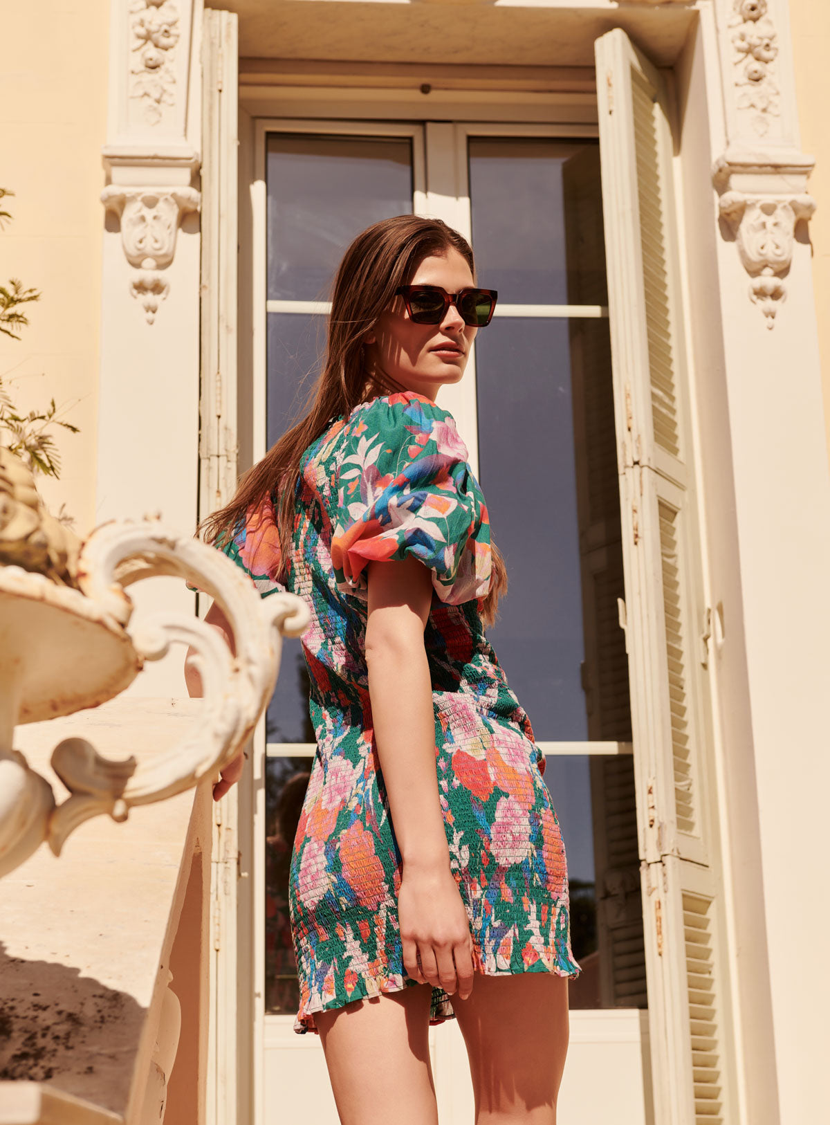 Robe courte smokée avec manches courtes bouffantes.