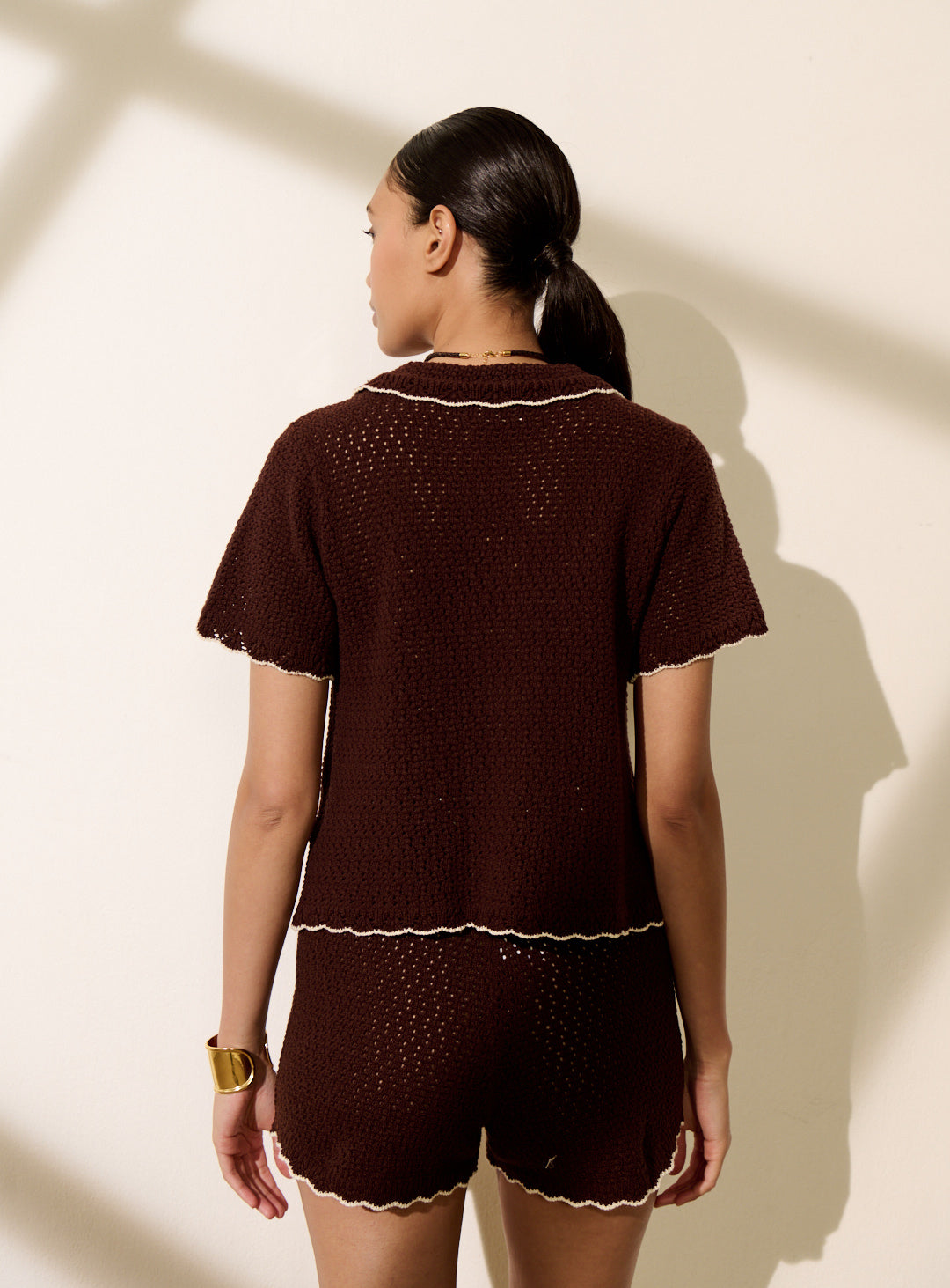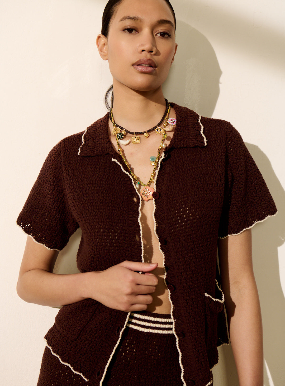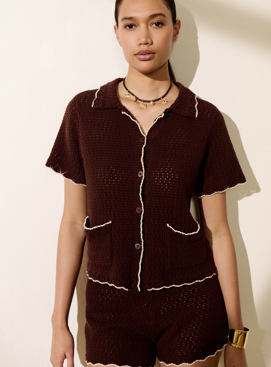 Warum wir es lieben: Dieses luftig-leichte Strickhemd vereint Leichtigkeit und Struktur. Der kurze Schnitt und die aufgesetzten Taschen verleihen ihm einen modernen Look, während die Knopfleiste es ermöglicht, es geschlossen oder über einem Top zu tragen. Ein unkompliziertes Basic, perfekt zu High-Waist-Jeans.