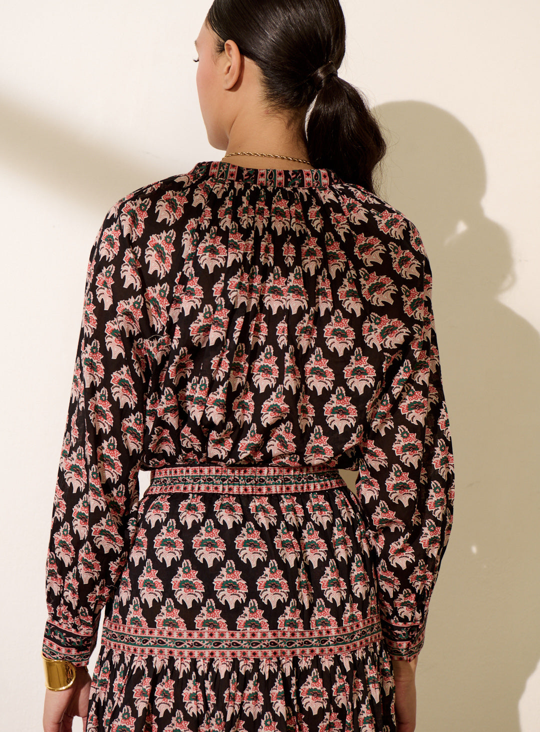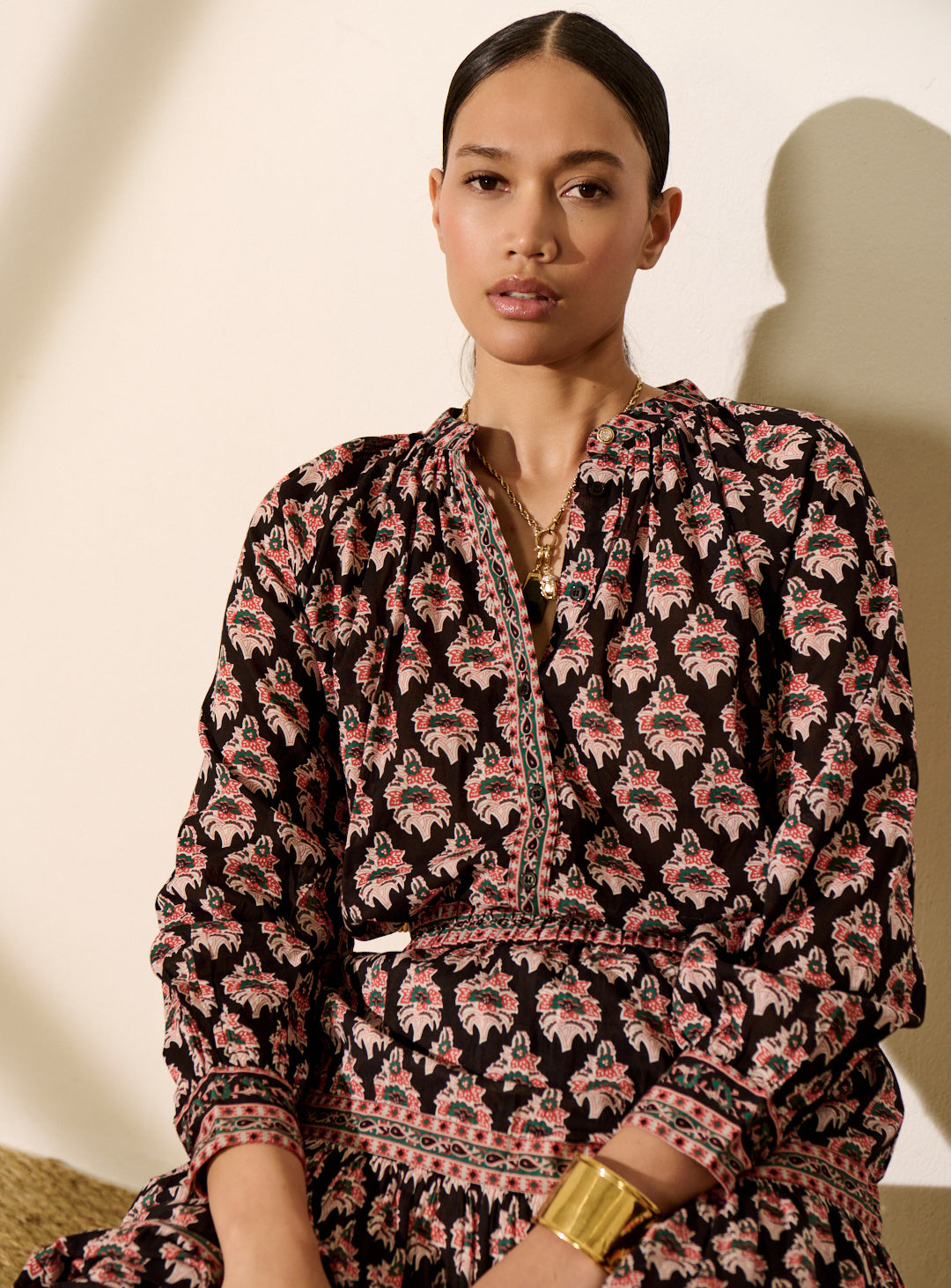Pourquoi nous l'aimons : Son imprimé multicolore apporte une touche vibrante et pleine de personnalité à la silhouette. Sa coupe ample et oversize, associée à une matière fluide et légère, la rend particulièrement confortable et facile à porter. On aime aussi ses manches longues et bouffantes, ainsi que son bouton bijou délicat au col qui signe la pièce avec élégance. Imprimé exclusif Petite Mendigote.