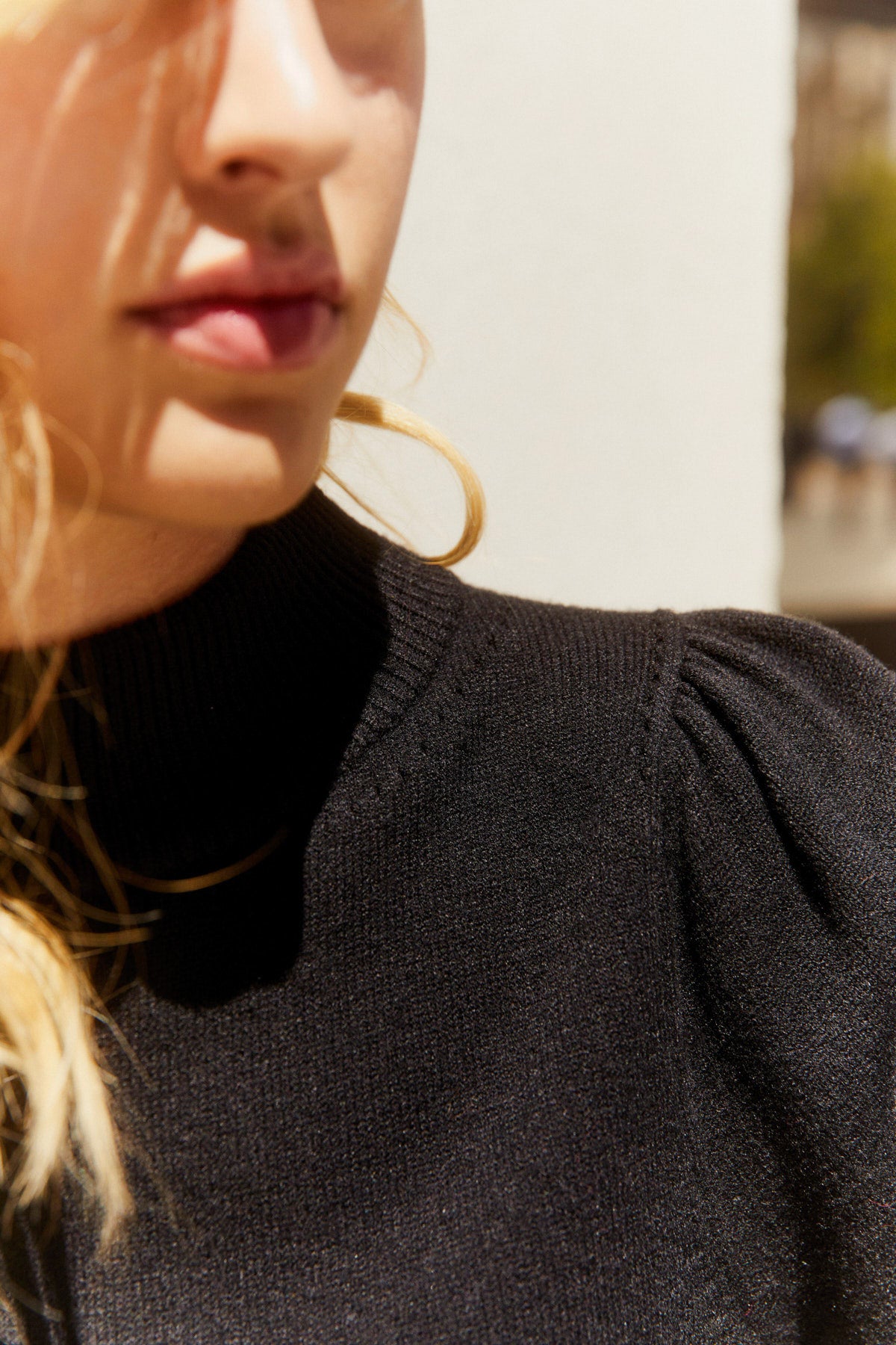 Kurzes Strickkleid. Mit langen Puffärmeln, die an den Handgelenken enger werden. Der Kragen ist hoch. Das Kleid wird ab der Taille enger geschnürt, um einen Röhrenkleid-Effekt zu erzielen.