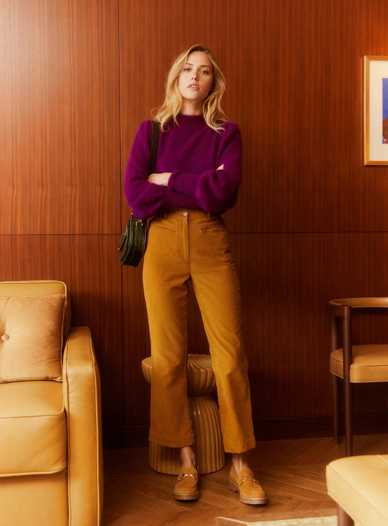 Langärmliger Pullover, der am Handgelenk enger wird. Mit hohem Kragen. Trägt sich locker.