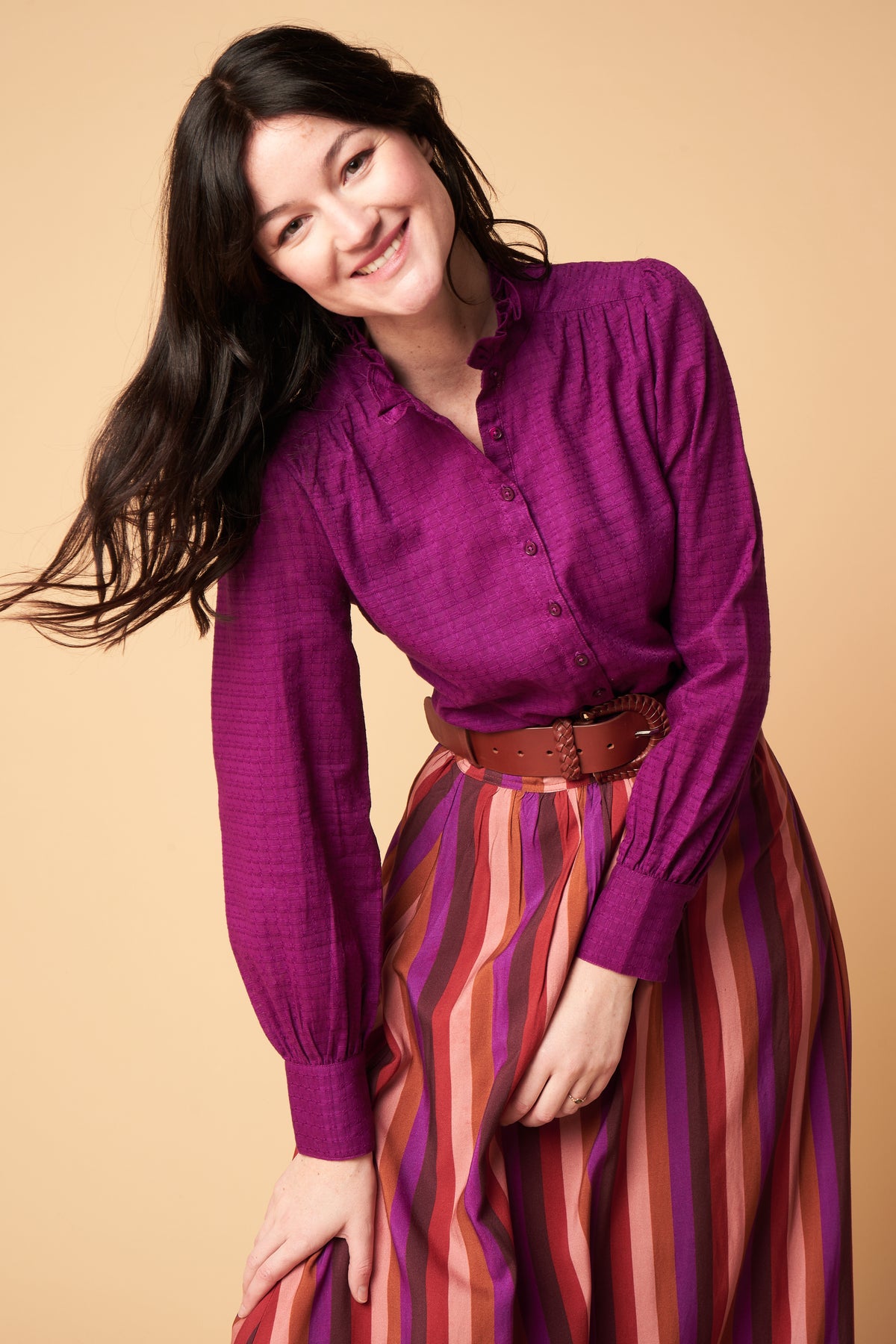 Ein gerade besticktes Hemd. Mit hohem, gerafftem Kragen. Die Ärmel sind leicht gepufft und an den Handgelenken enger.