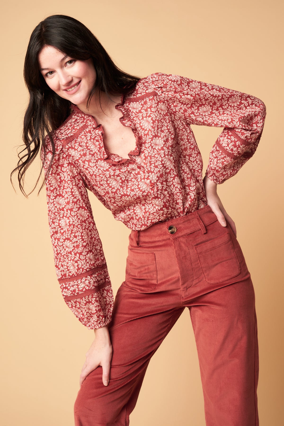Gemustertes Hemd, V-Ausschnitt, Puffärmel.