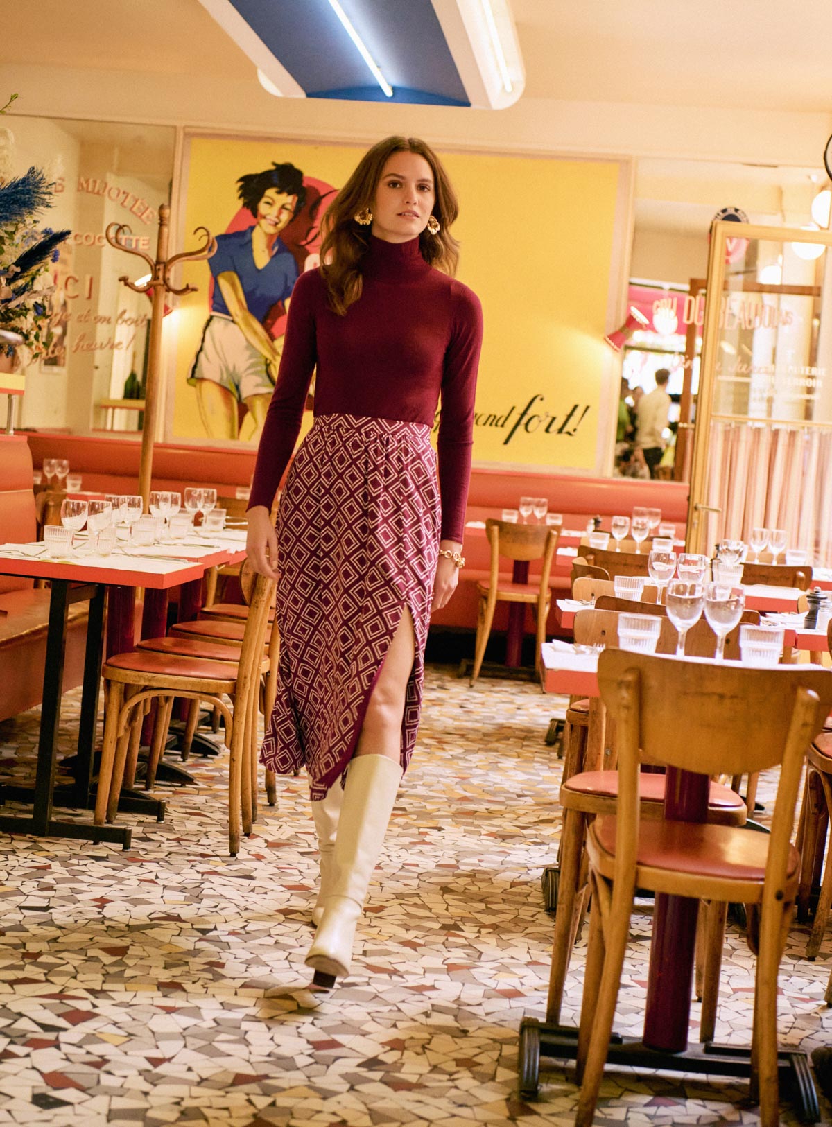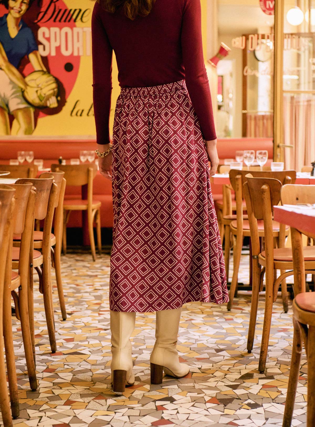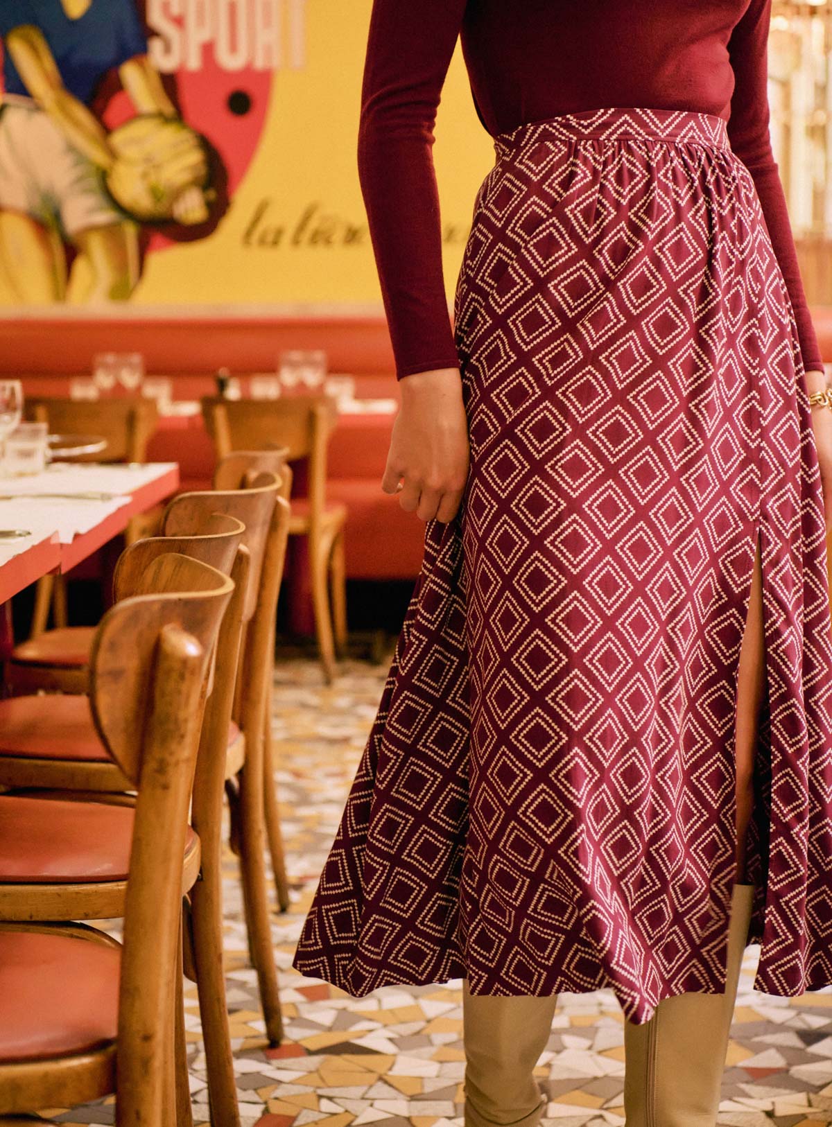 Long, flowing skirt with geometric print - Burgundy