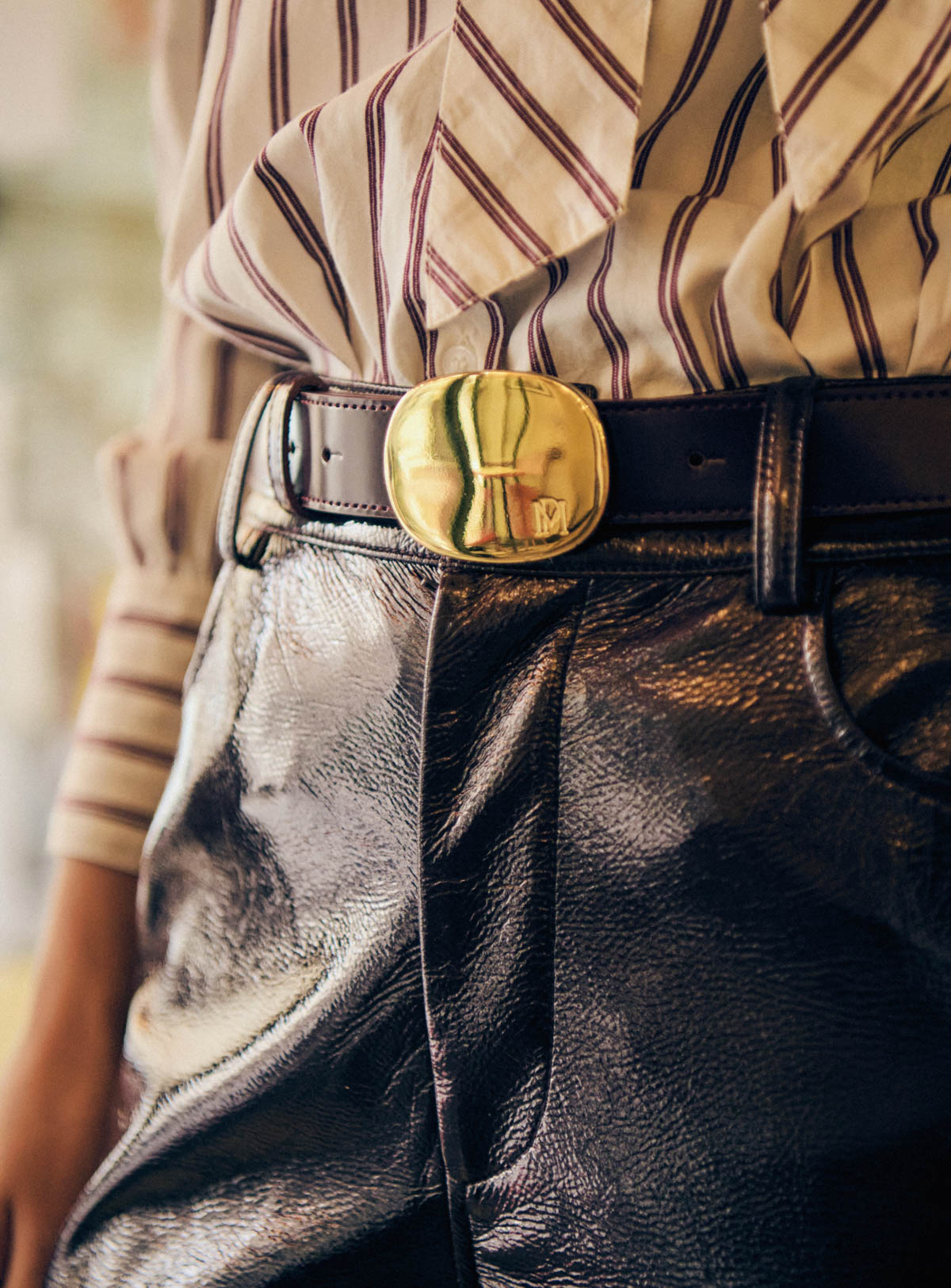 Why we love it: These vinyl pants with shiny finishes are the statement piece of the season. Pair them with the Tory striped shirt over the Mania undershirt for a look that's both sharp and sophisticated.