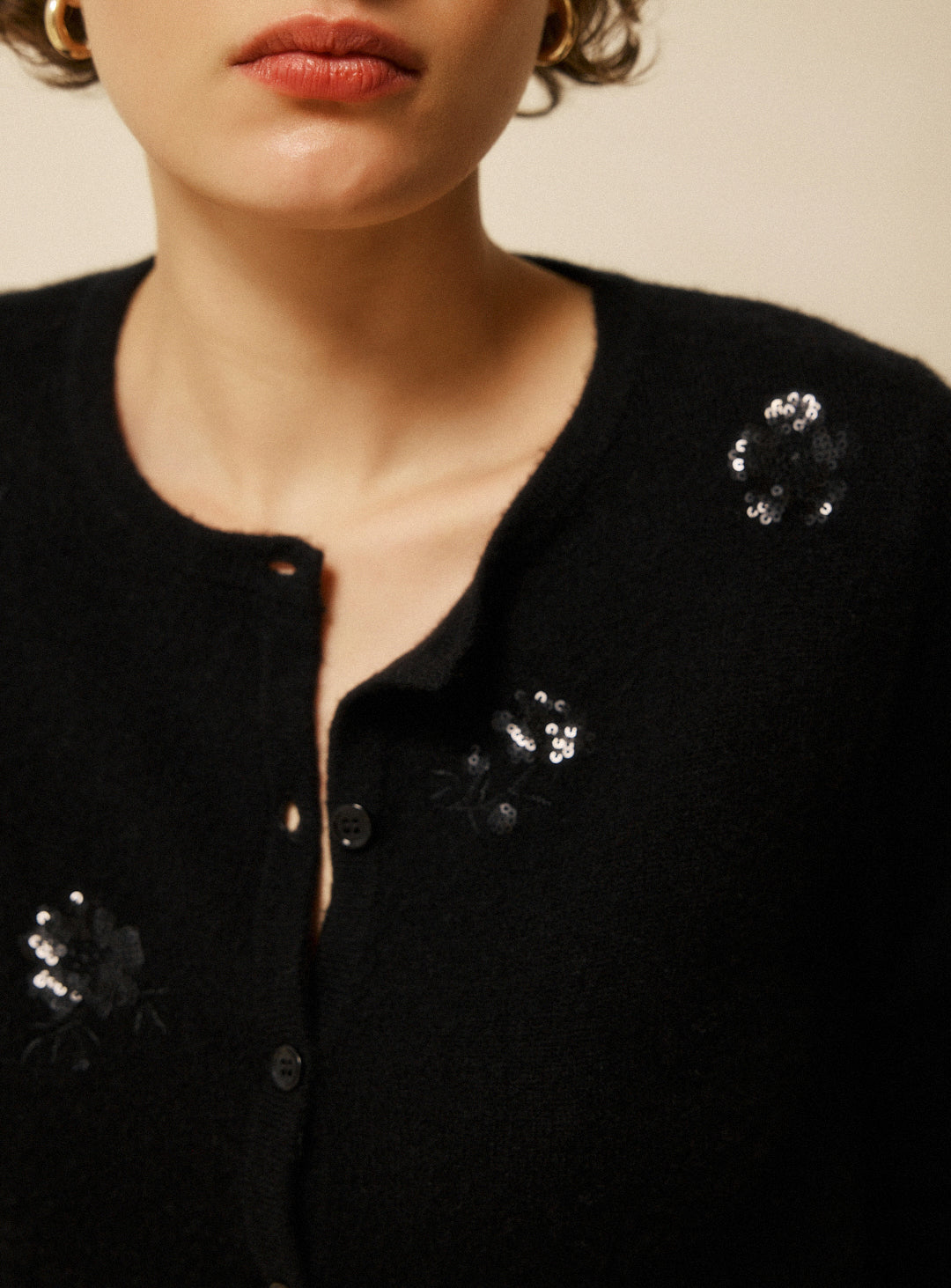 Why we love it: The Myriam cardigan, the timeless cardigan of the season, is now available in a festive and special occasion version! Made from fine black knit and adorned with sequined flowers on the front, it adds just the right touch of sparkle to your outfits. Wear it alone or as a twin set with our Marine sleeveless sweater for a chic and modern look, perfect for the holidays.
