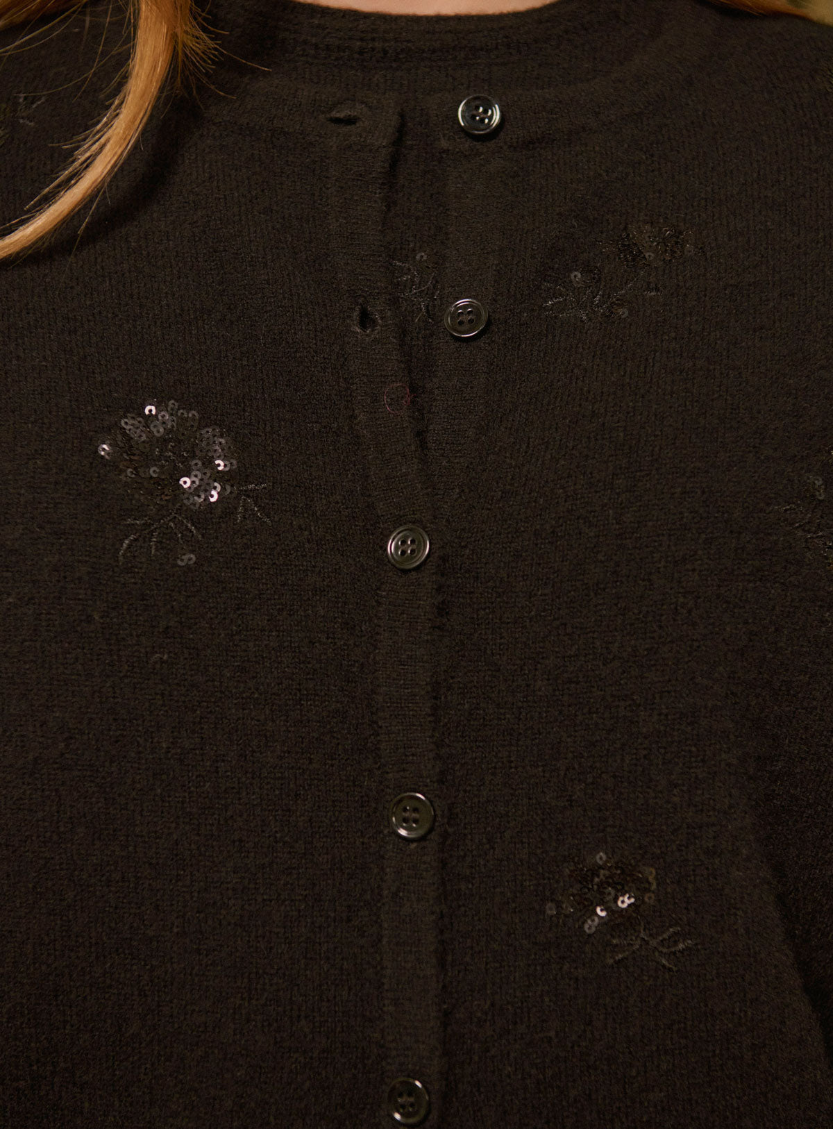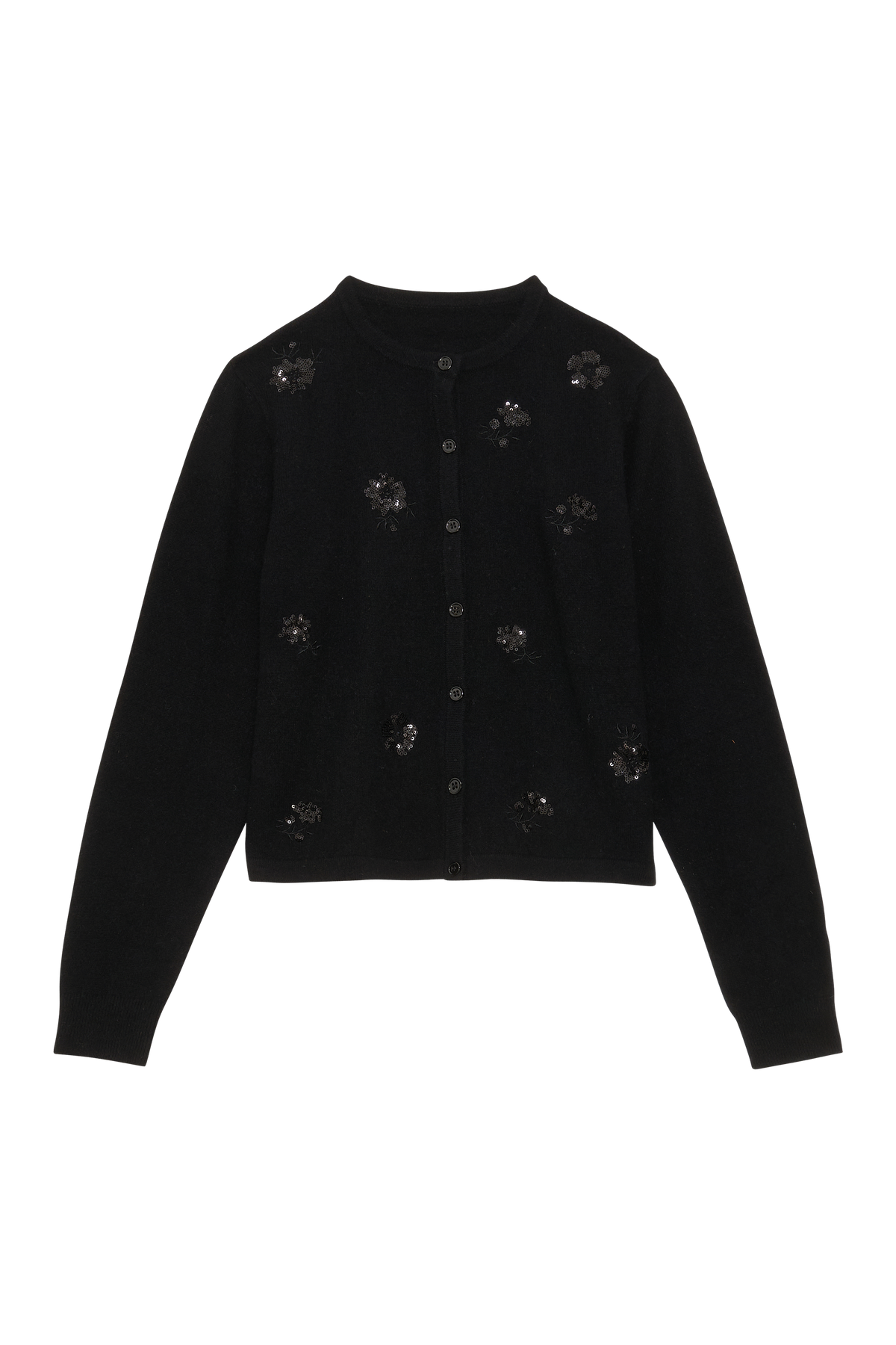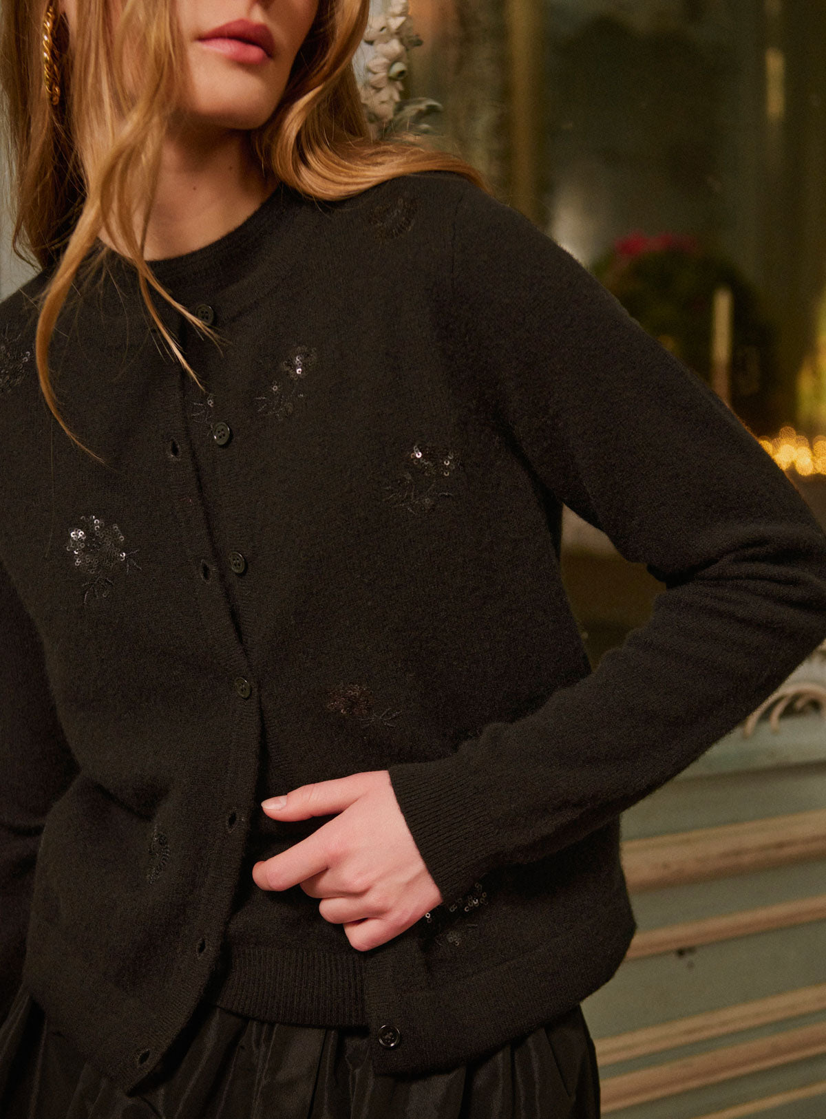 Why we love it: The Myriam cardigan, the timeless cardigan of the season, is now available in a festive and special occasion version! Made from fine black knit and adorned with sequined flowers on the front, it adds just the right touch of sparkle to your outfits. Wear it alone or as a twin set with our Marine sleeveless sweater for a chic and modern look, perfect for the holidays.