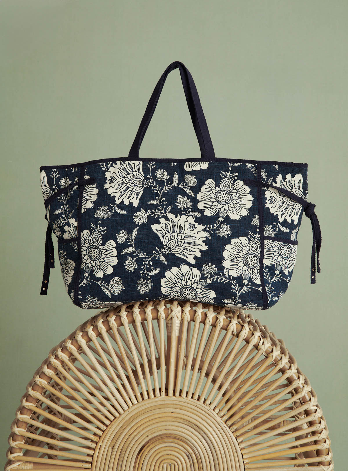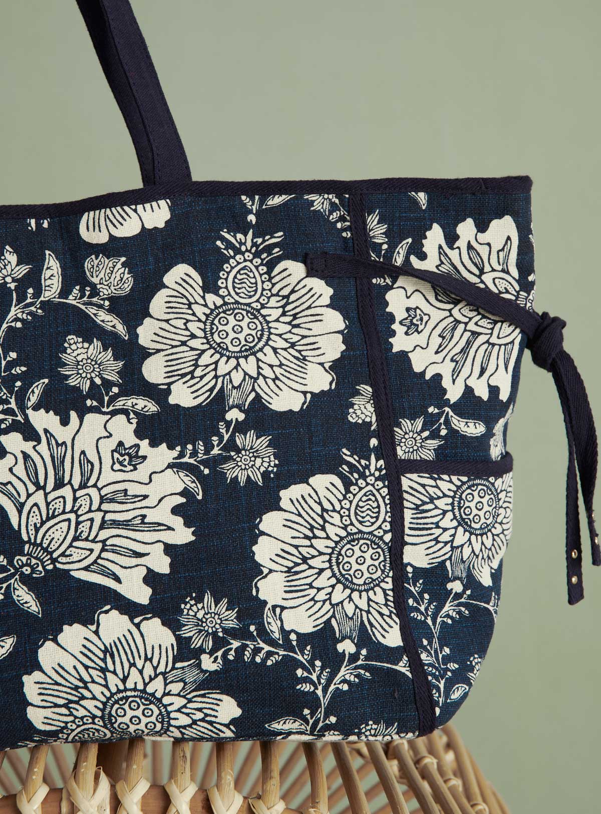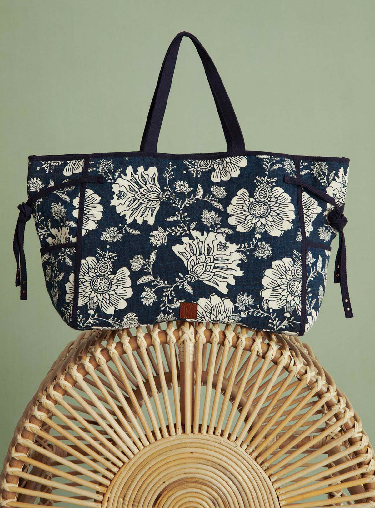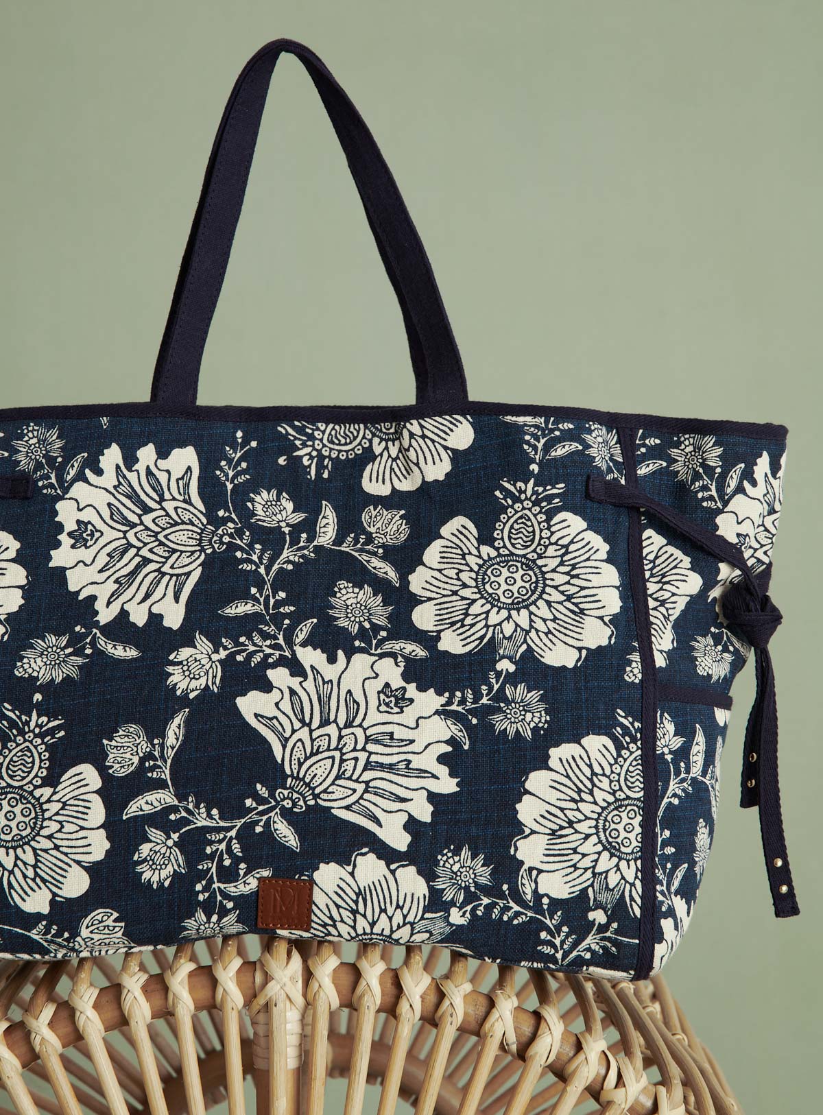 Cabas en toile avec des petites anses. Fermeture aimantée. Avec des poches sur le côté. Logo en cuir cousu à l'extérieur.