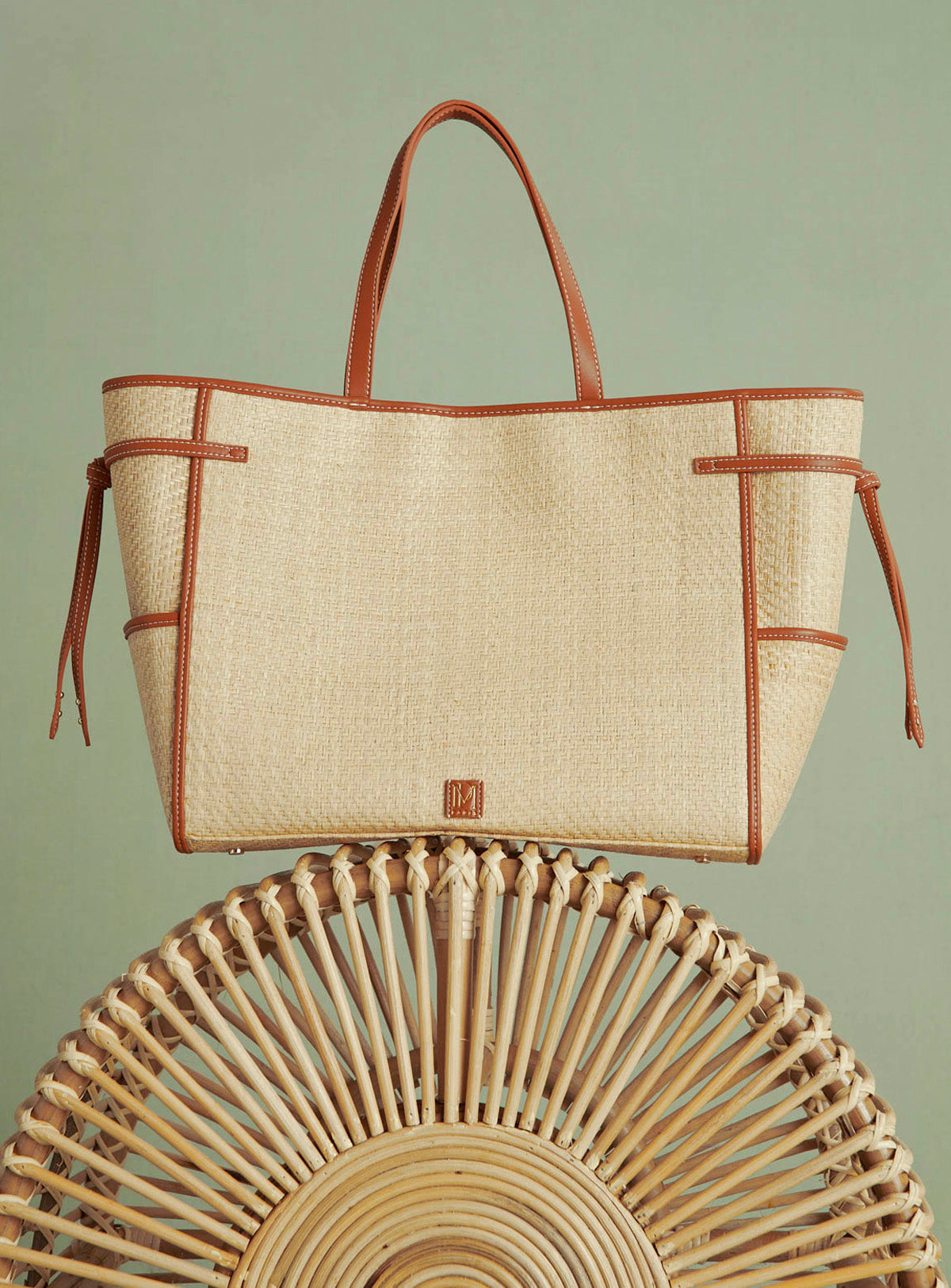 Cabas en raphia avec des petites anses. Fermeture aimantée. Logo en cuir cousu à l'extérieur.