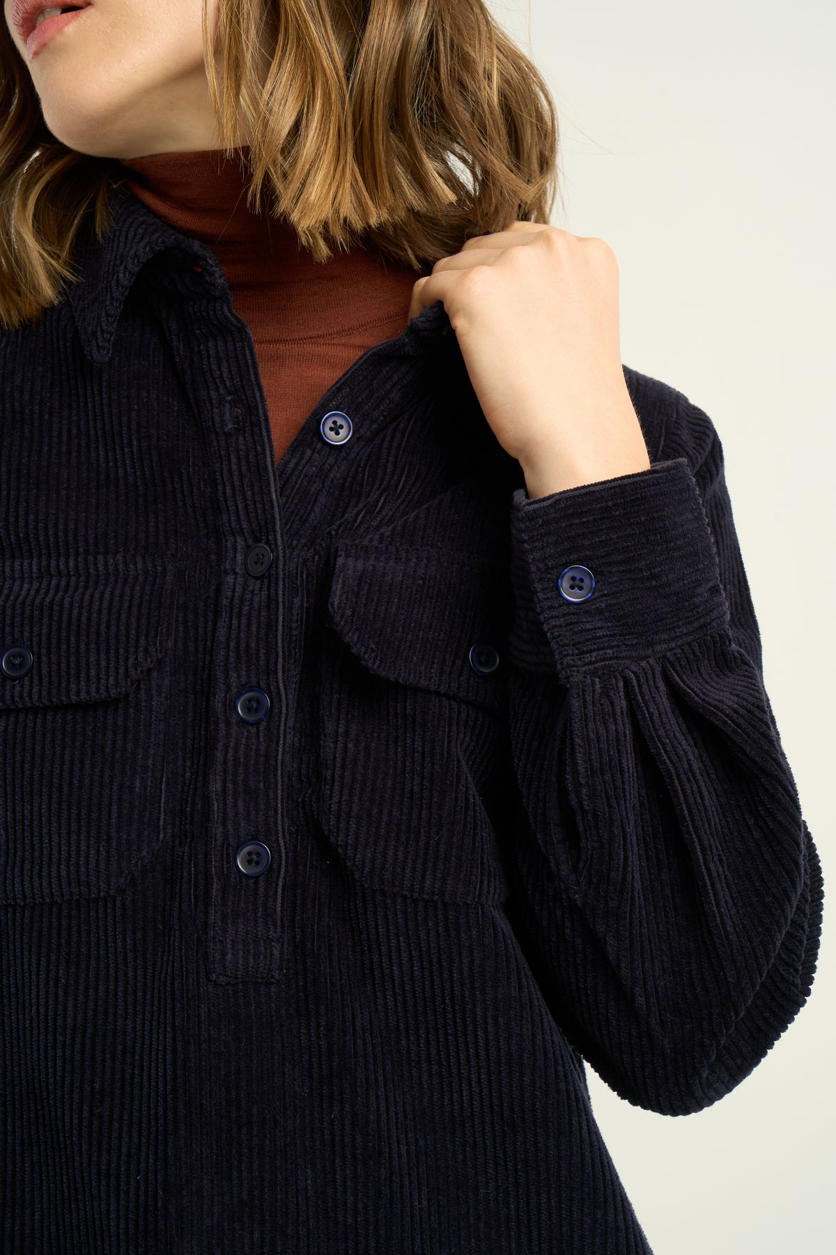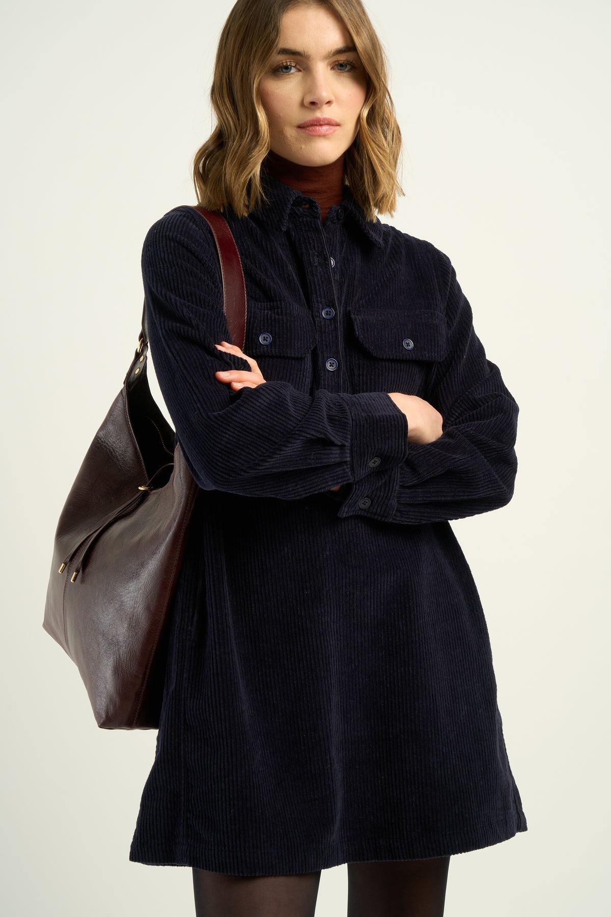 Pourquoi nous l'aimons : La robe chemise dans sa version la plus désirable pour la saison. En velours côtelé, elle réchauffe l’allure tout en revisitant un classique avec modernité. Sa coupe droite et ses poches discrètes soulignent une élégance naturelle, facile à porter du matin jusqu’au soir, sans jamais en faire trop.