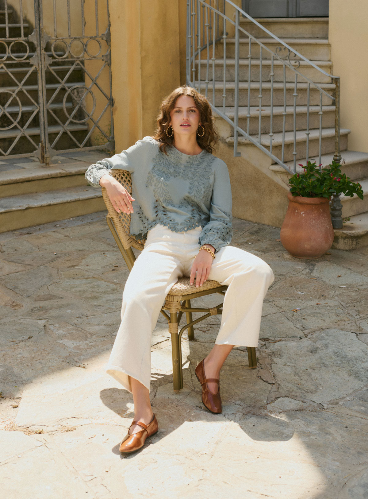 Pourquoi nous l’aimons : Cette blouse en coton se distingue par ses broderies raffinées et ses détails ajourés qui dessinent un motif feuillage délicat. Sa coupe fluide et ses finitions festonnées lui apportent une touche romantique, parfaite à associer avec notre jean taille haute PHILIPPINE ou un pantalon fluide pour un look chic et décontracté.