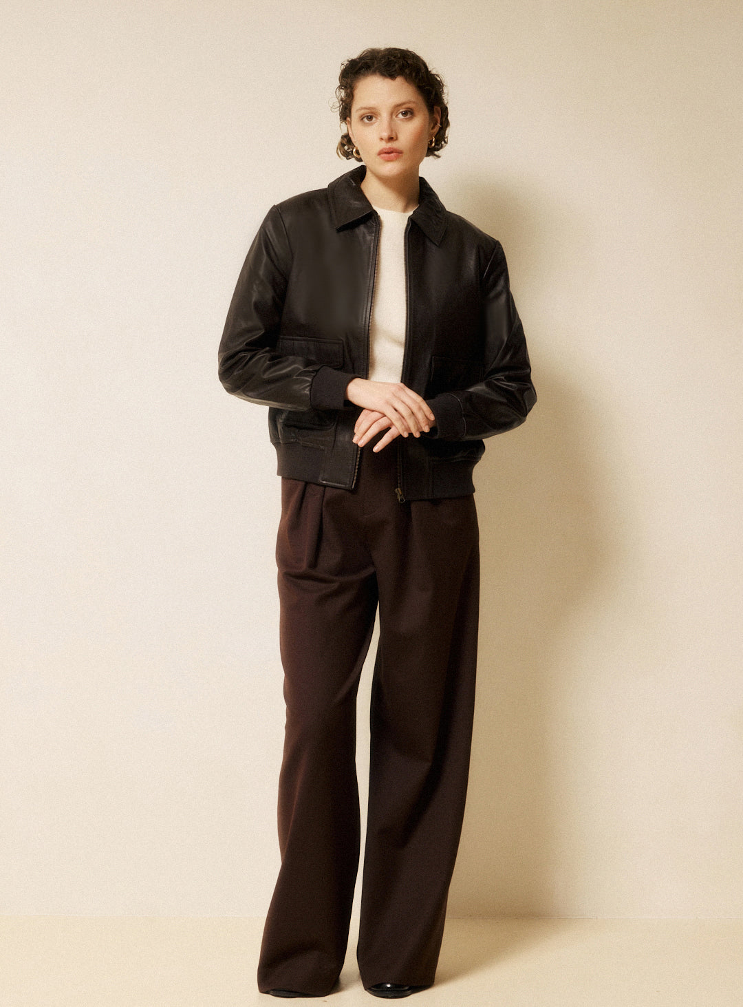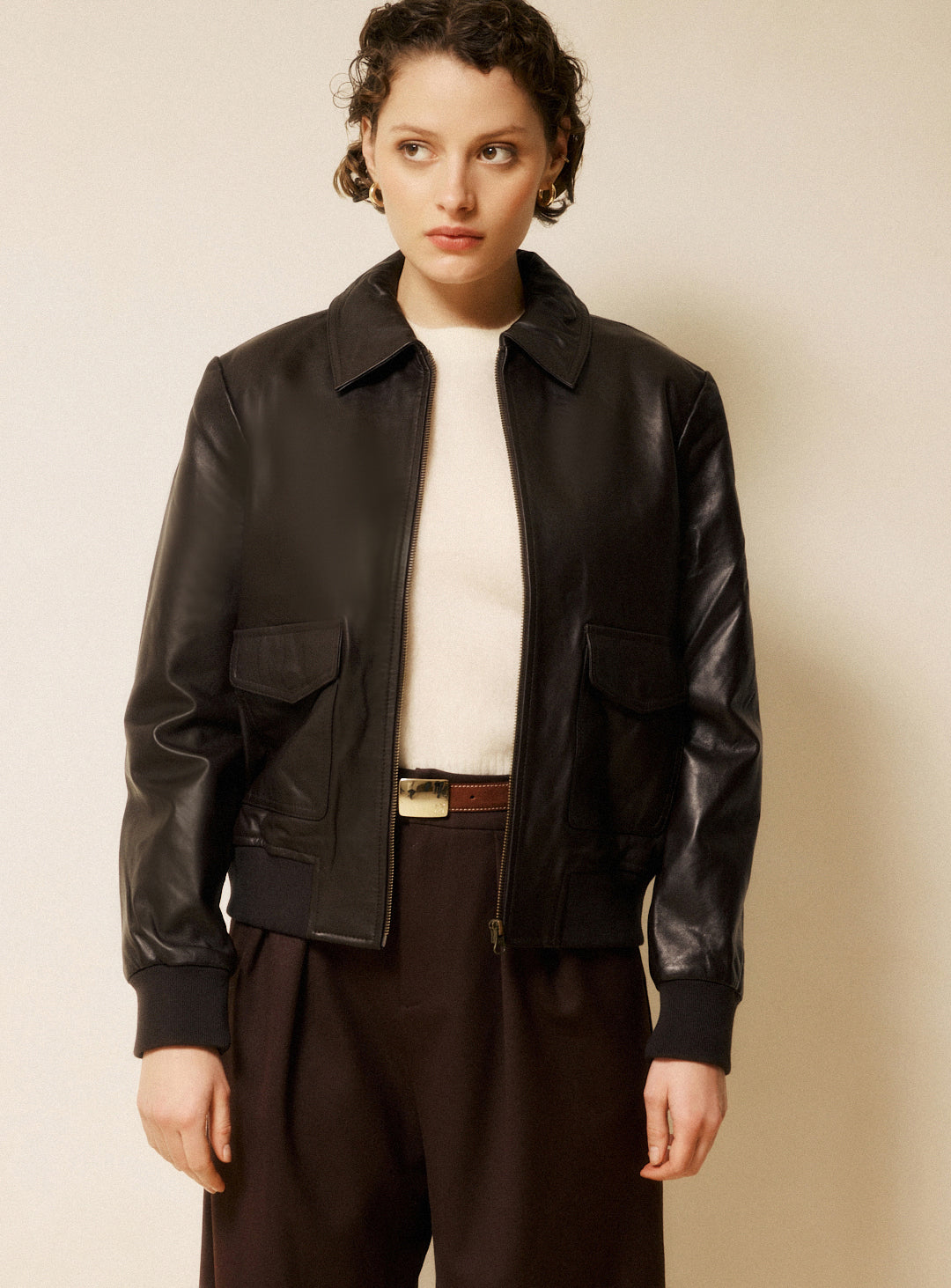 Pourquoi nous l’aimons : Avec son allure inspirée du vestiaire aviateur, la veste bomber Lola en cuir conjugue modernité et caractère. Facile à porter, elle habille instantanément un jean ou une jupe, apportant une touche cool et affirmée à vos looks du quotidien.