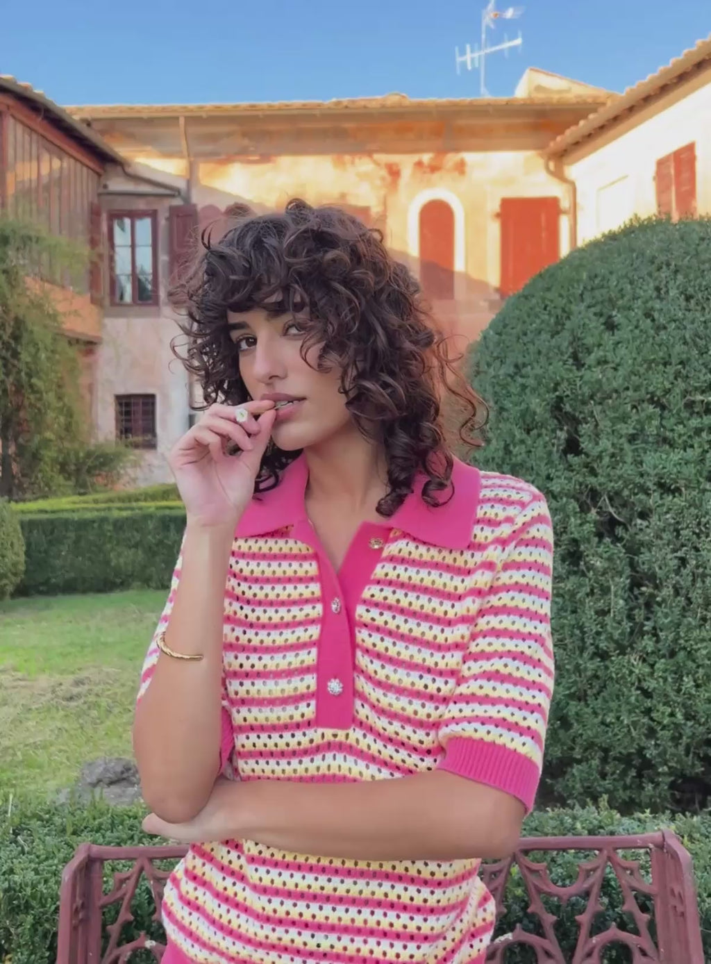 Pourquoi nous l'aimons : Ce top en maille ajourée séduit par ses rayures colorées. Son col effet polo et sa demi-ouverture boutonnée lui apportent une touche rétro revisitée, tandis que ses boutons bijoux ajoutent une note raffinée. Léger et facile à porter, il s’associe aussi bien avec un jean qu’avec une jupe fluide pour un look frais et lumineux.