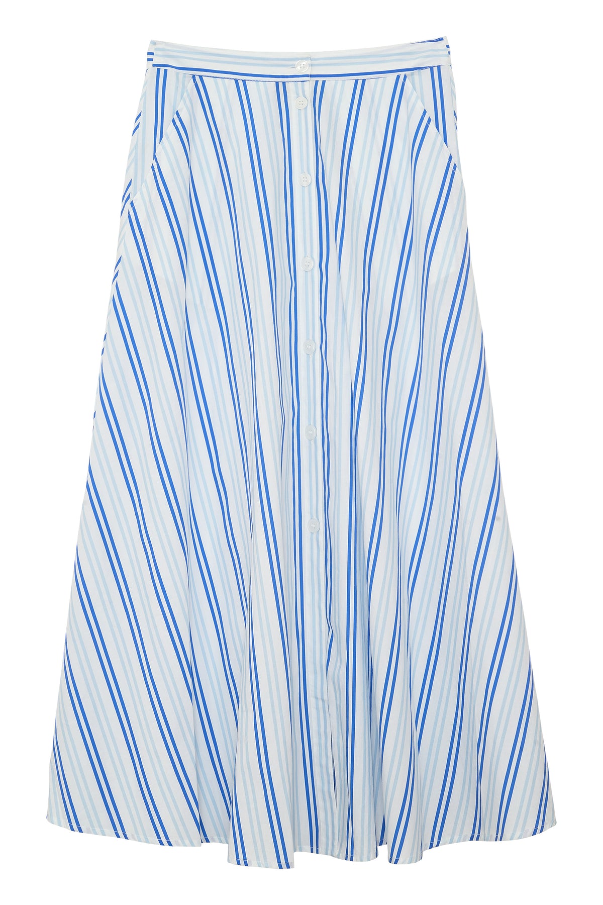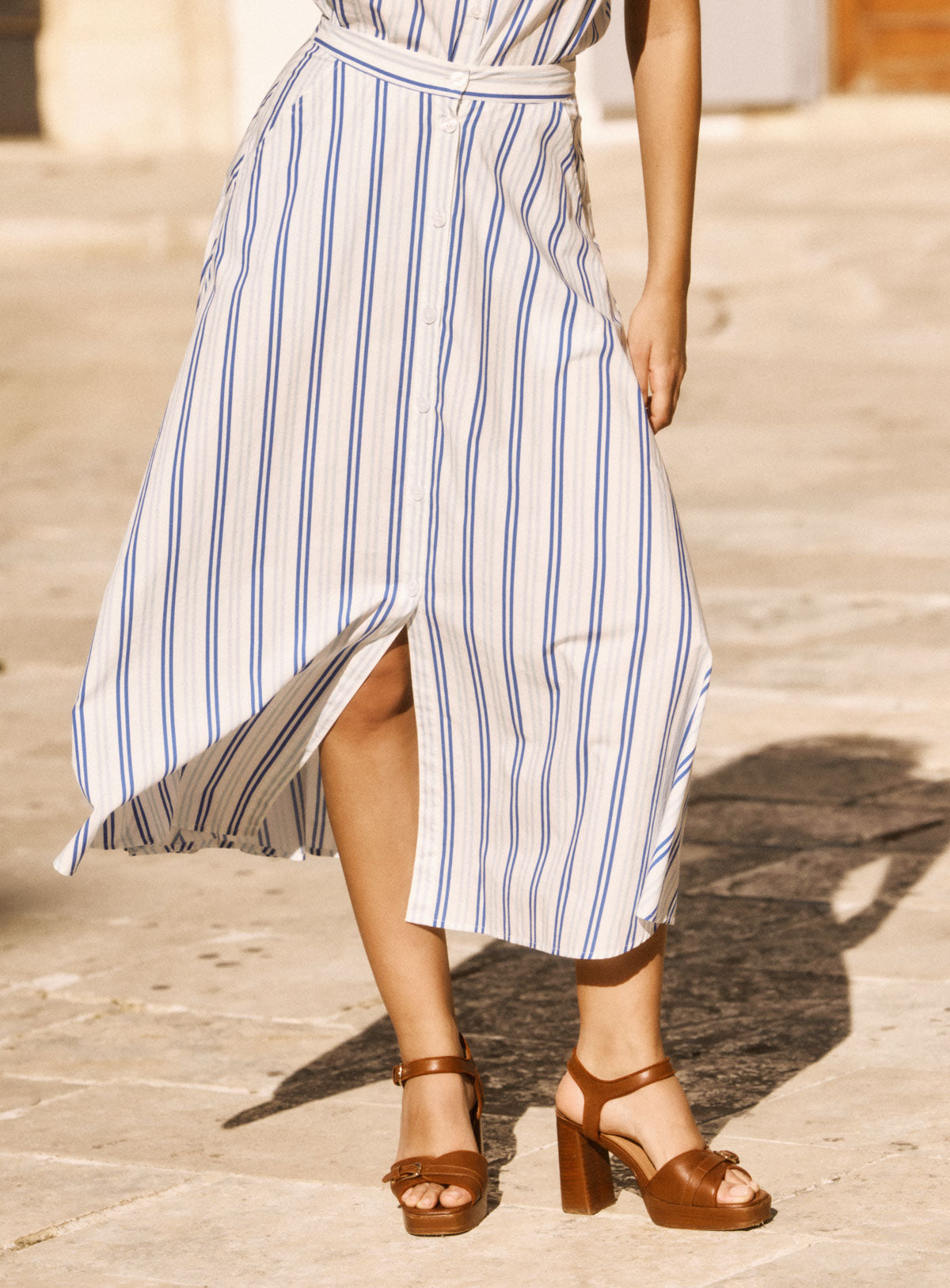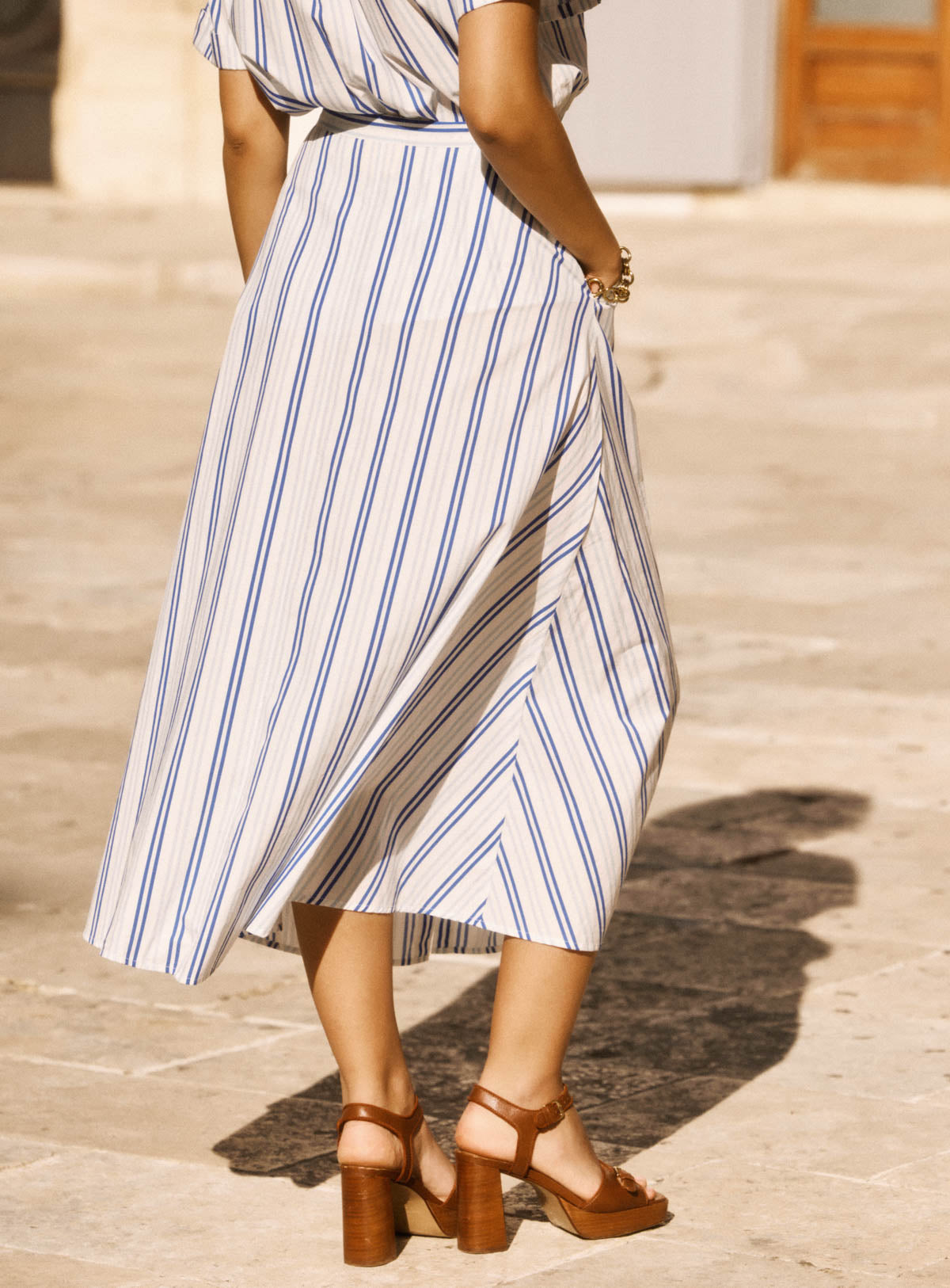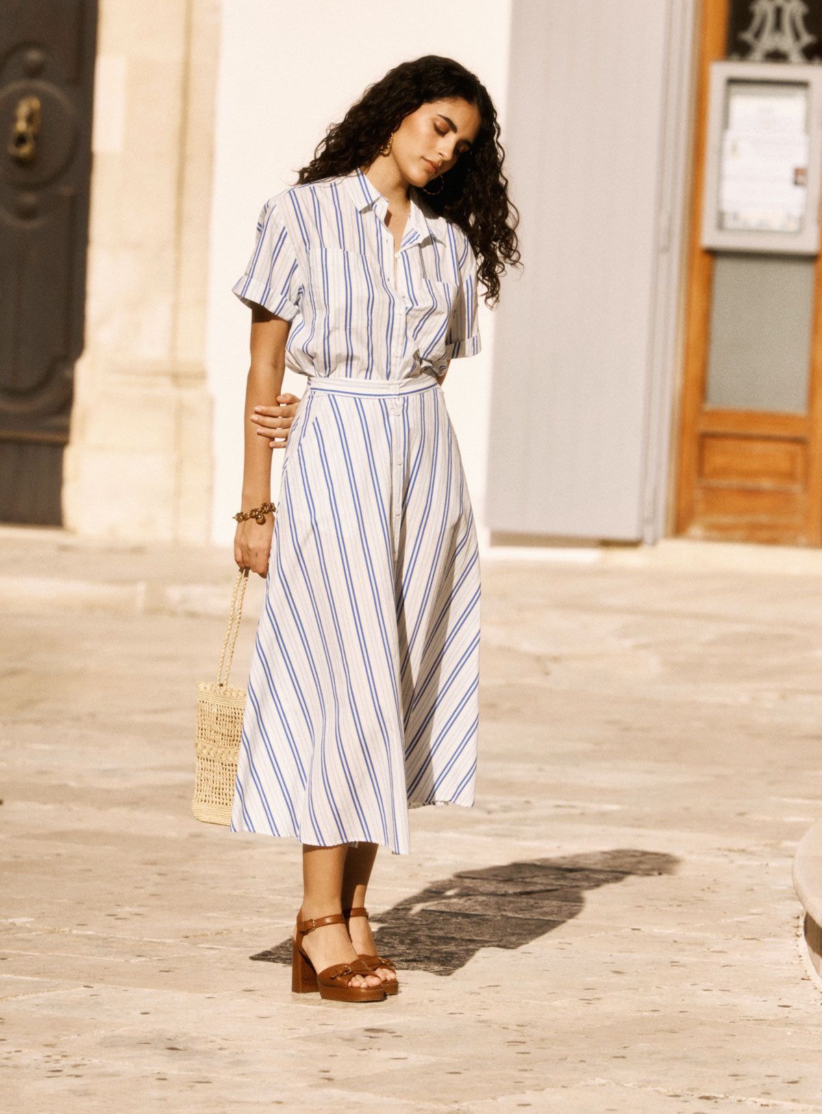 Pourquoi nous l'aimons : Cette jupe rayée bleu associe confort et élégance avec son tissu léger et son ouverture boutonnée subtile. Parfaite pour un look bohème chic, elle s’accorde parfaitement avec la chemise VICK pour un total look coloré et élégant. Cet ensemble séduit par ses rayures qui allongent la silhouette avec élégance. Le jeu de lignes apporte structure et légèreté, tandis que la coupe fluide assure un porté confortable et féminin. Une allure facile, à porter au quotidien comme pour les beaux moments de la saison.