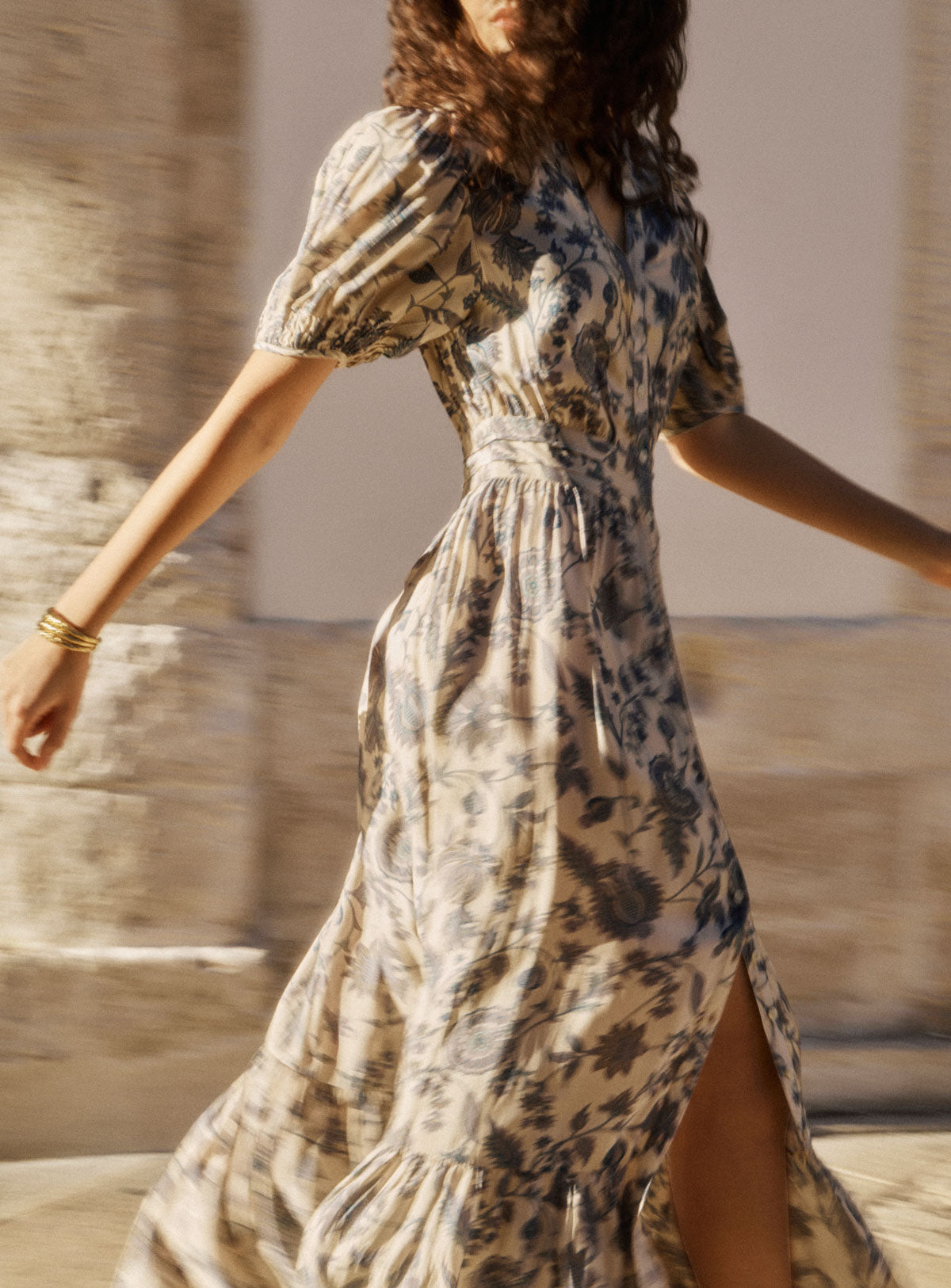 Pourquoi nous l’aimons : La robe longue AMITA évoque les beaux jours avec élégance. Son imprimé délicat et sa fluidité accompagnent chaque mouvement pour une allure douce et aérienne. Un imprimé floral tout en douceur, aux teintes bleues délicates. Comme une touche d’aquarelle, une matière fluide et légère… parfait pour l’arrivée des beaux jours.