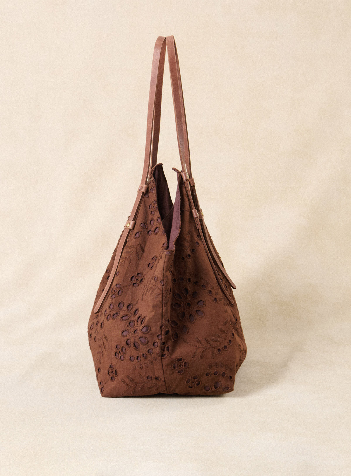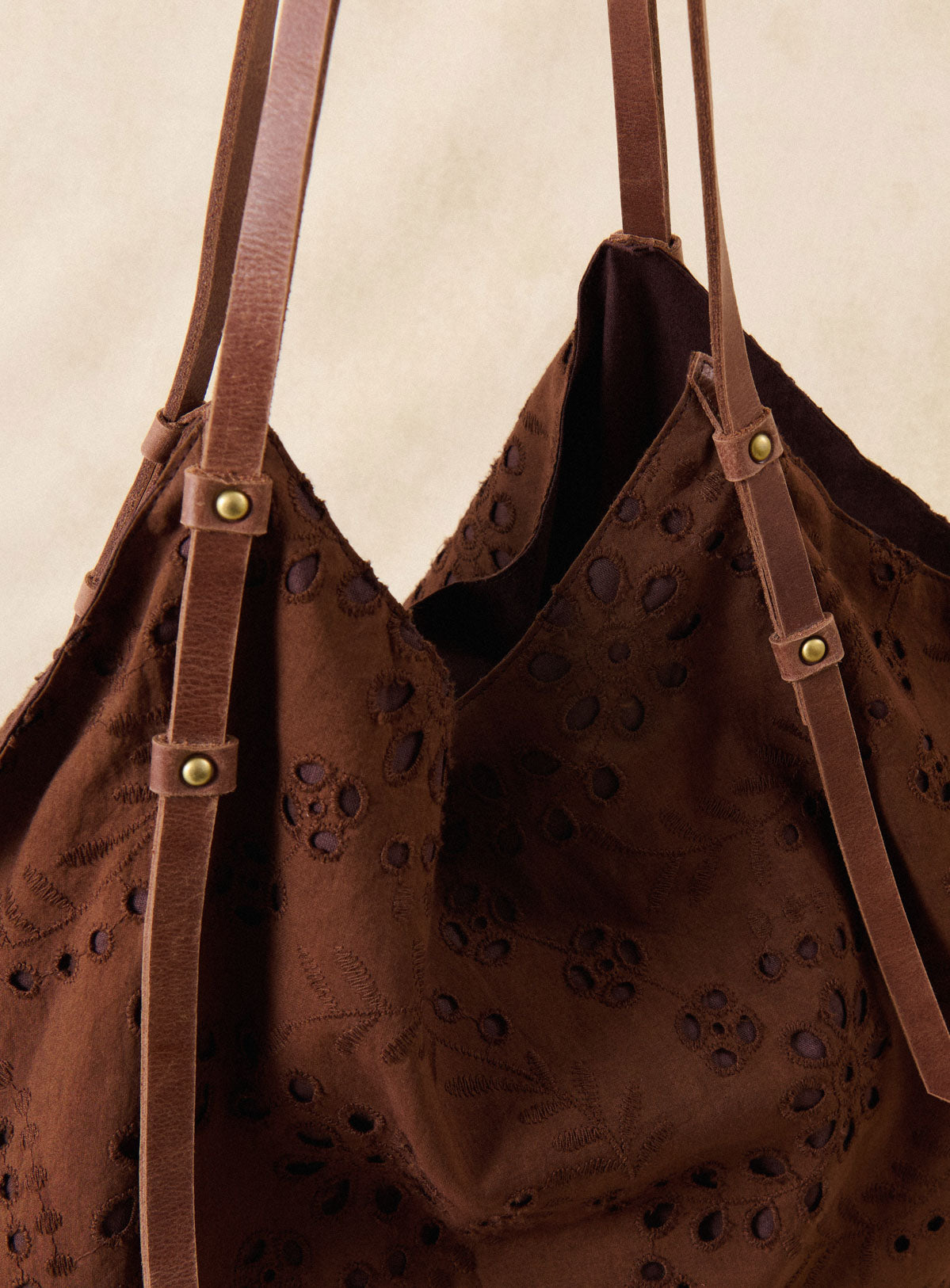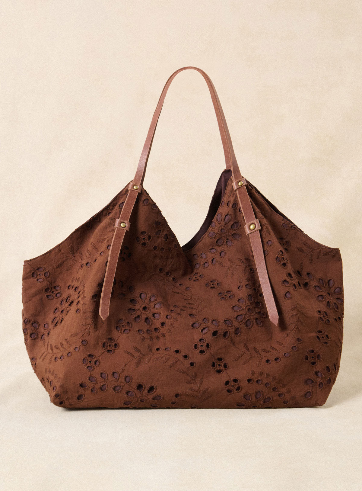 Solene - Grand cabas souple en toile brodé ajouré marron