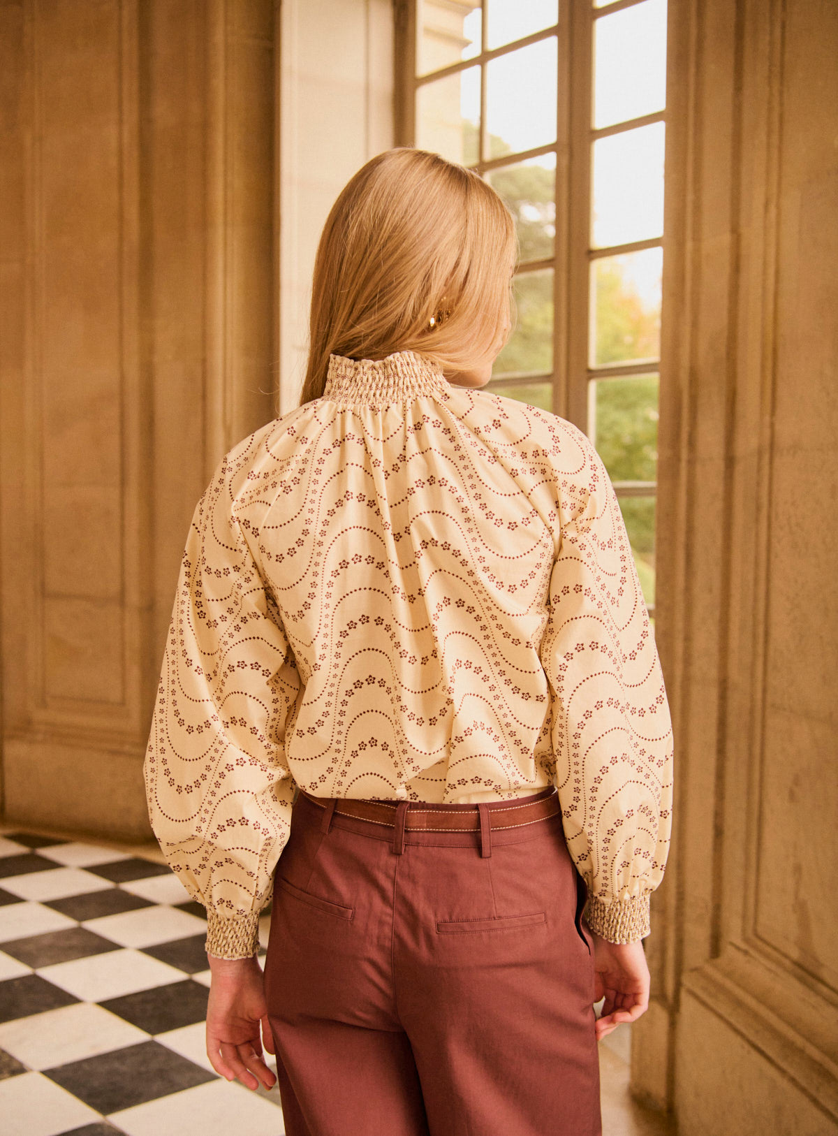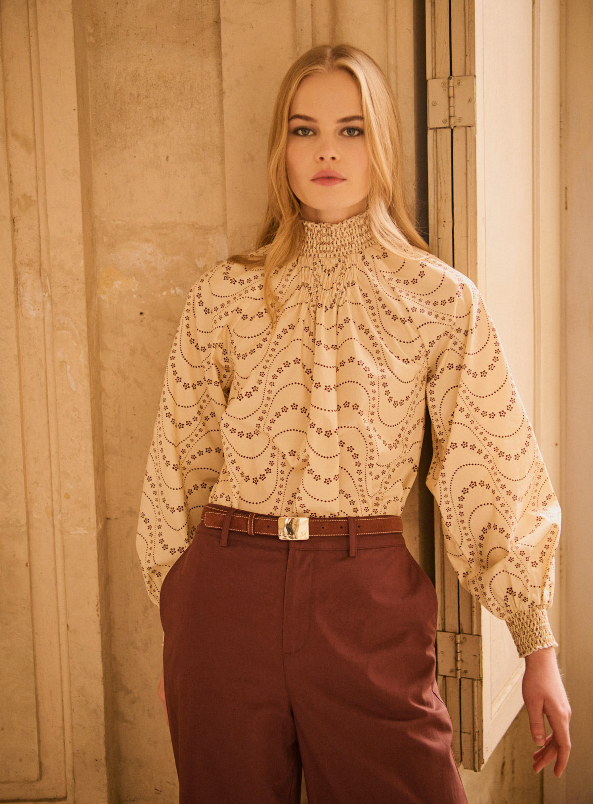 Pourquoi nous l’aimons : Son imprimé délicat et son col froncé apportent une touche romantique immédiate. Une blouse qui structure la silhouette tout en douceur, parfaite glissée dans un pantalon taille haute pour un look chic sans effort.