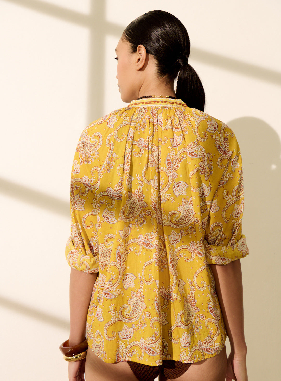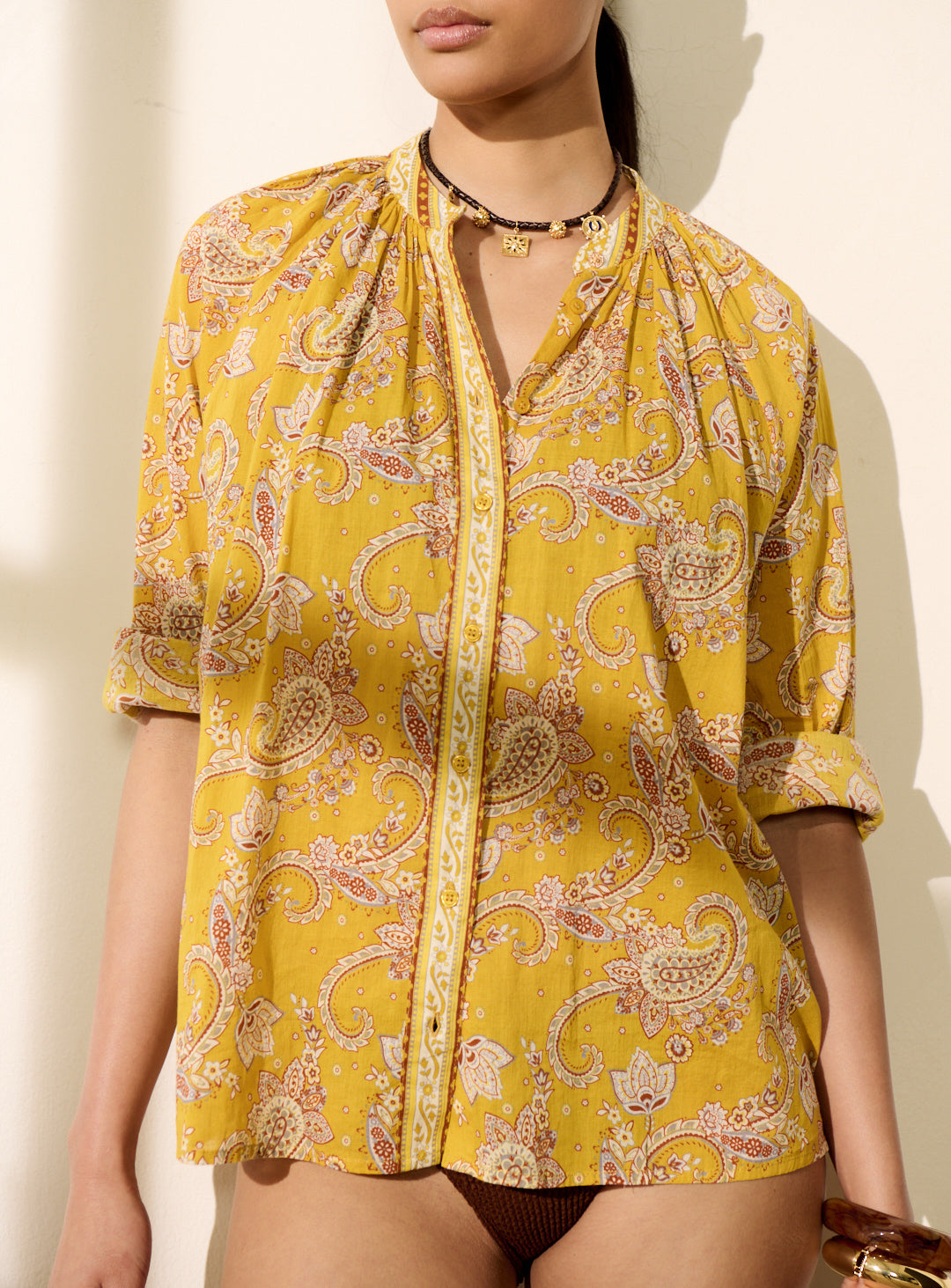 Pourquoi nous l'aimons : Son imprimé coloré apporte une touche vibrante et pleine de personnalité à la silhouette. Sa coupe ample et oversize, associée à une matière fluide et légère, la rend particulièrement confortable et facile à porter. On aime aussi ses manches longues et bouffantes, ainsi que son bouton bijou délicat au col qui signe la pièce avec élégance.