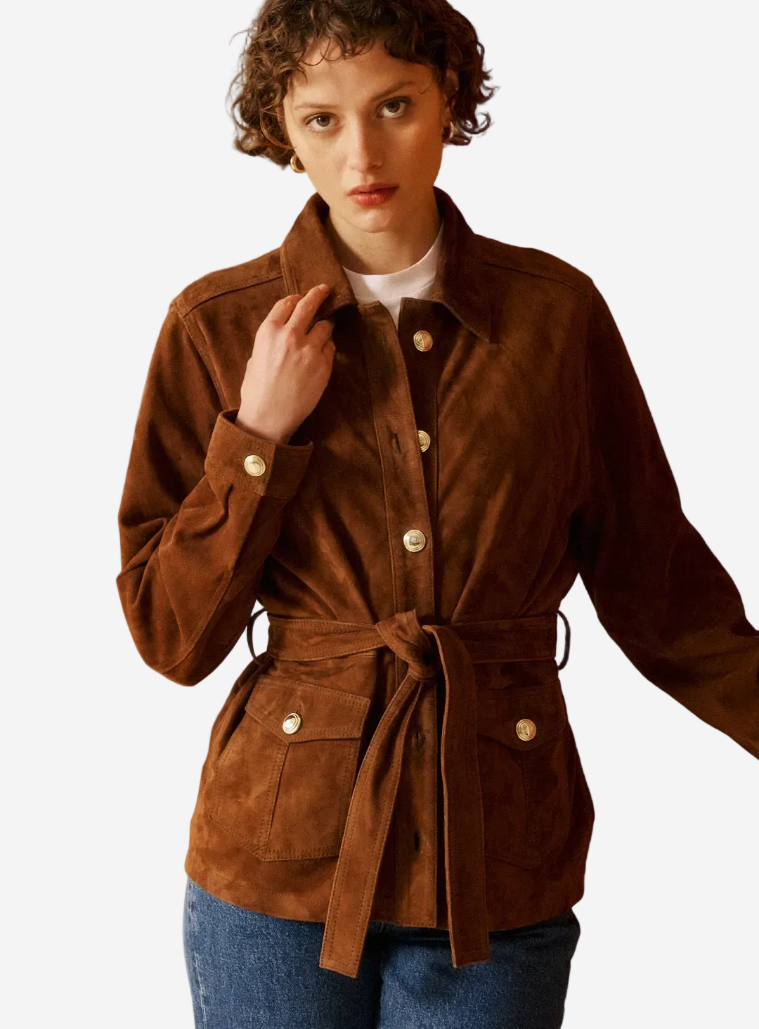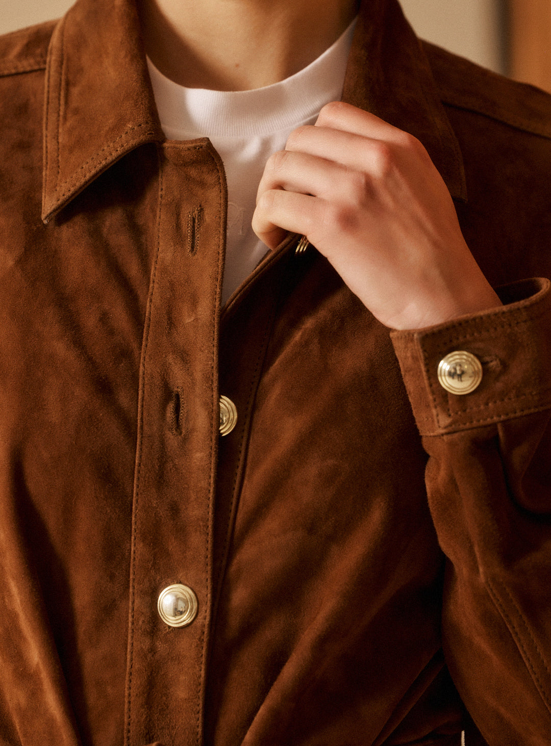 Pourquoi nous l'aimons : Cette veste en daim brut allie simplicité et caractère. Parfaite pour un look casual chic, elle se marie aussi bien avec un pantalon blanc qu'un short en denim brut.